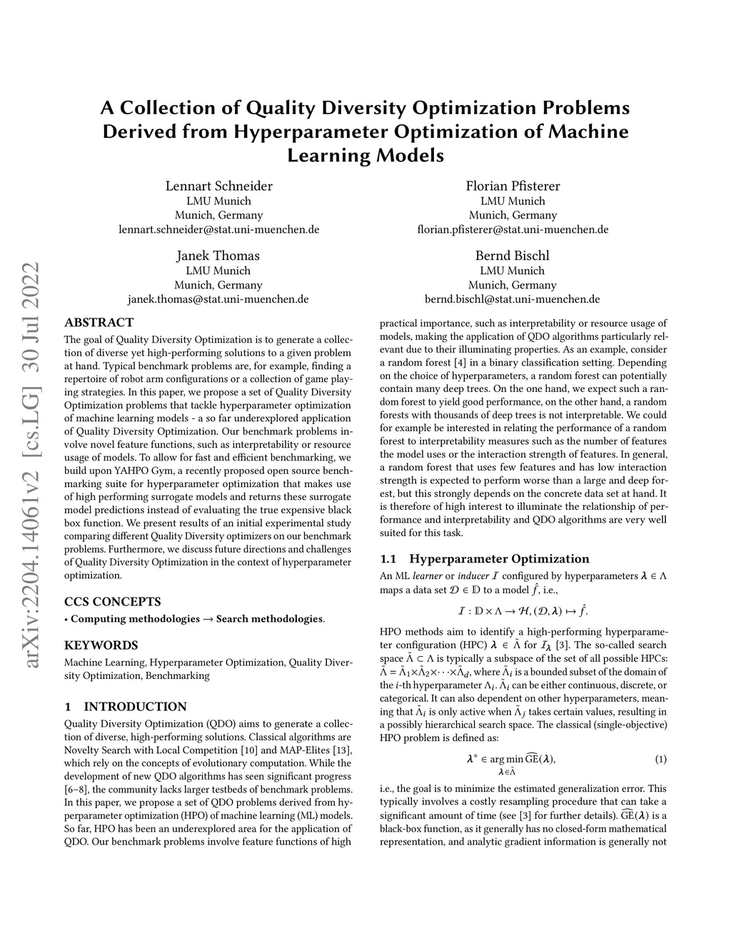 The goal of Quality Diversity Optimization is to generate a collection of diverse yet high-performing solutions to a given problem at hand. Typical benchmark problems are, for example, finding a repertoire of robot arm configurations or a collection of game playing strategies. In this paper, we propose a set of Quality Diversity Optimization problems that tackle hyperparameter optimization of machine learning models - a so far underexplored application of Quality Diversity Optimization. Our benchmark problems involve novel feature functions, such as interpretability or resource usage of models. To allow for fast and efficient benchmarking, we build upon YAHPO Gym, a recently proposed open source benchmarking suite for hyperparameter optimization that makes use of high performing surrogate models and returns these surrogate model predictions instead of evaluating the true expensive black box function. We present results of an initial experimental study comparing different Quality Diversity optimizers on our benchmark problems. Furthermore, we discuss future directions and challenges of Quality Diversity Optimization in the context of hyperparameter optimization.
