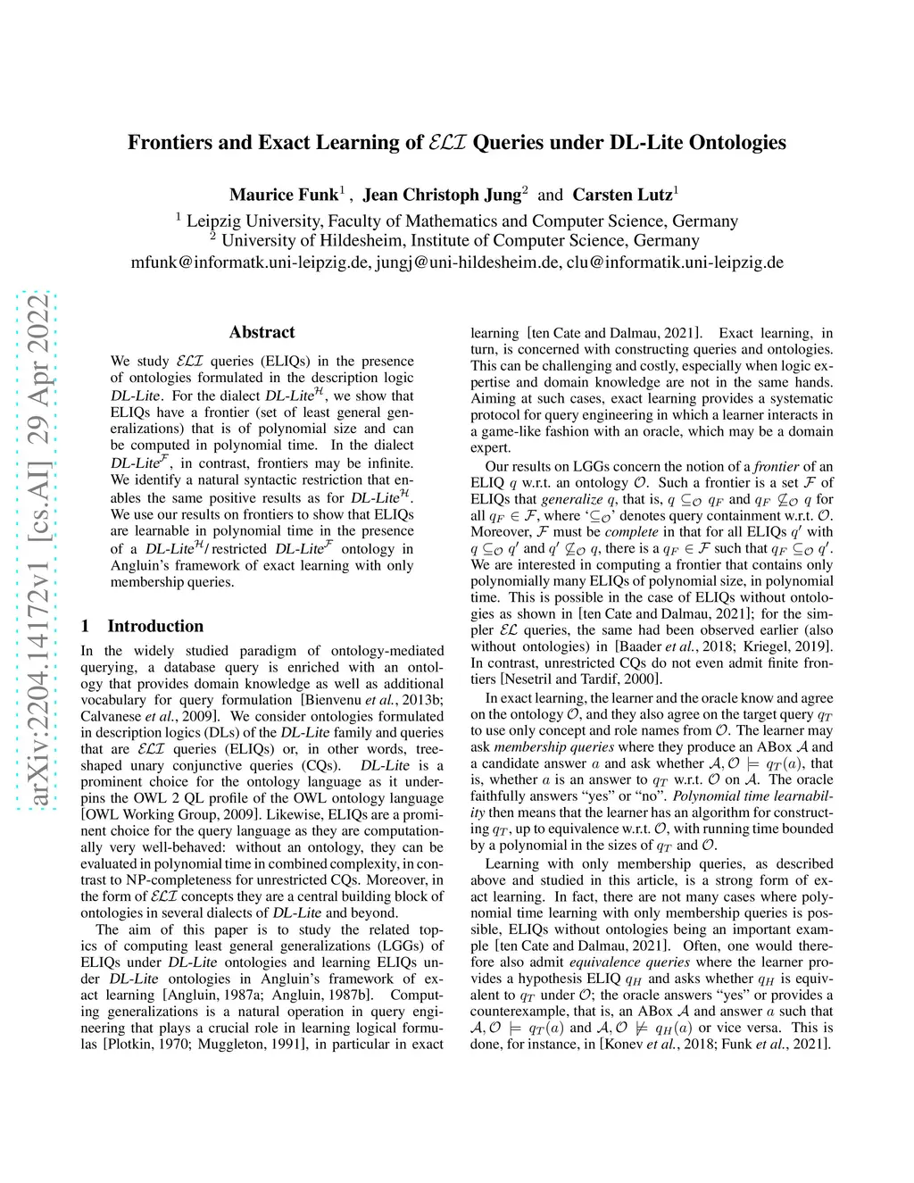 We study ELI queries (ELIQs) in the presence of ontologies formulated in the description logic DL-Lite. For the dialect DL-LiteH, we show that ELIQs have a frontier (set of least general generalizations) that is of polynomial size and can be computed in polynomial time. In the dialect DL-LiteF, in contrast, frontiers may be infinite. We identify a natural syntactic restriction that enables the same positive results as for DL-LiteH. We use out results on frontiers to show that ELIQs are learnable in polynomial time in the presence of a DL-LiteH / restricted DL-LiteF ontology in Angluin's framework of exact learning with only membership queries.