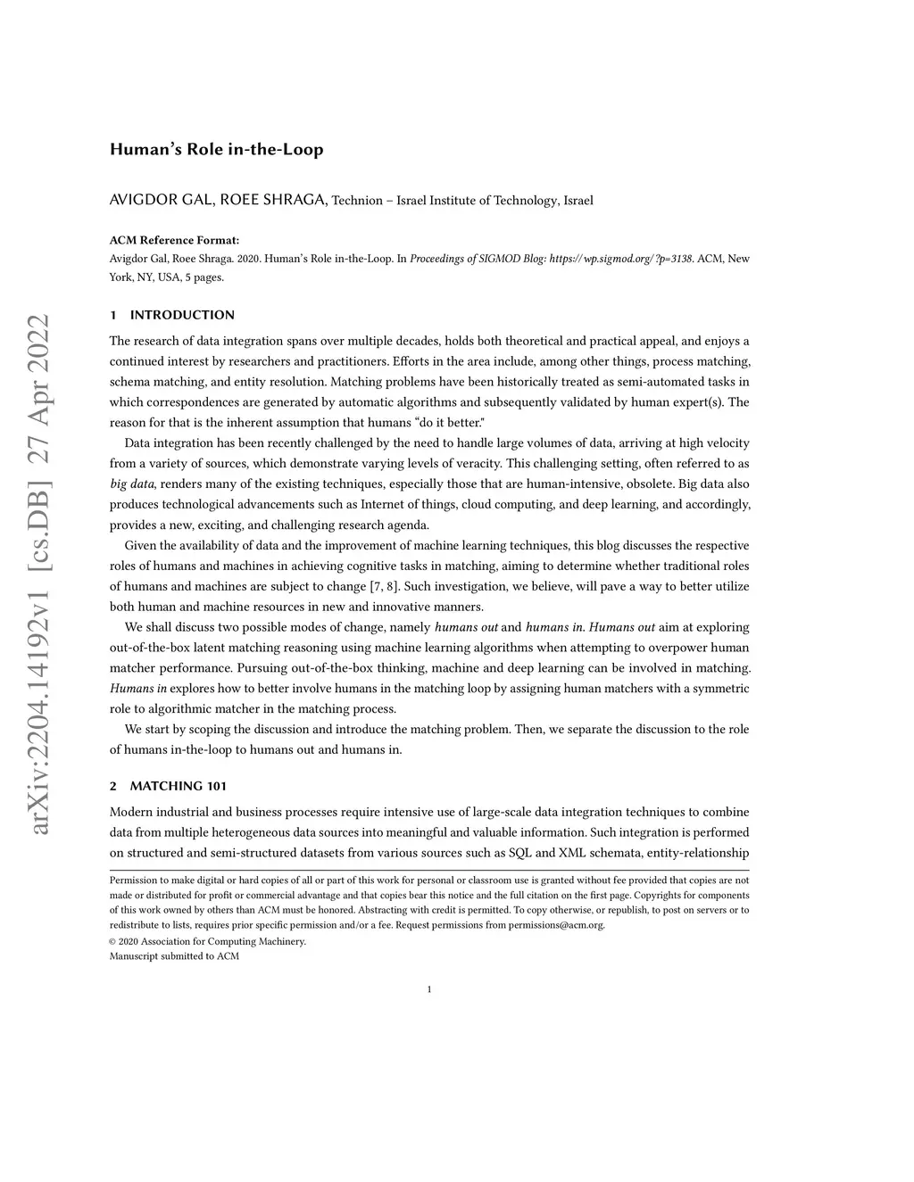 Data integration has been recently challenged by the need to handle large volumes of data, arriving at high velocity from a variety of sources, which demonstrate varying levels of veracity. This challenging setting, often referred to as big data, renders many of the existing techniques, especially those that are human-intensive, obsolete. Big data also produces technological advancements such as Internet of things, cloud computing, and deep learning, and accordingly, provides a new, exciting, and challenging research agenda. Given the availability of data and the improvement of machine learning techniques, this blog discusses the respective roles of humans and machines in achieving cognitive tasks in matching, aiming to determine whether traditional roles of humans and machines are subject to change. Such investigation, we believe, will pave a way to better utilize both human and machine resources in new and innovative manners. We shall discuss two possible modes of change, namely humans out and humans in. Humans out aim at exploring out-of-the-box latent matching reasoning using machine learning algorithms when attempting to overpower human matcher performance. Pursuing out-of-the-box thinking, machine and deep learning can be involved in matching. Humans in explores how to better involve humans in the matching loop by assigning human matchers with a symmetric role to algorithmic matcher in the matching process.
