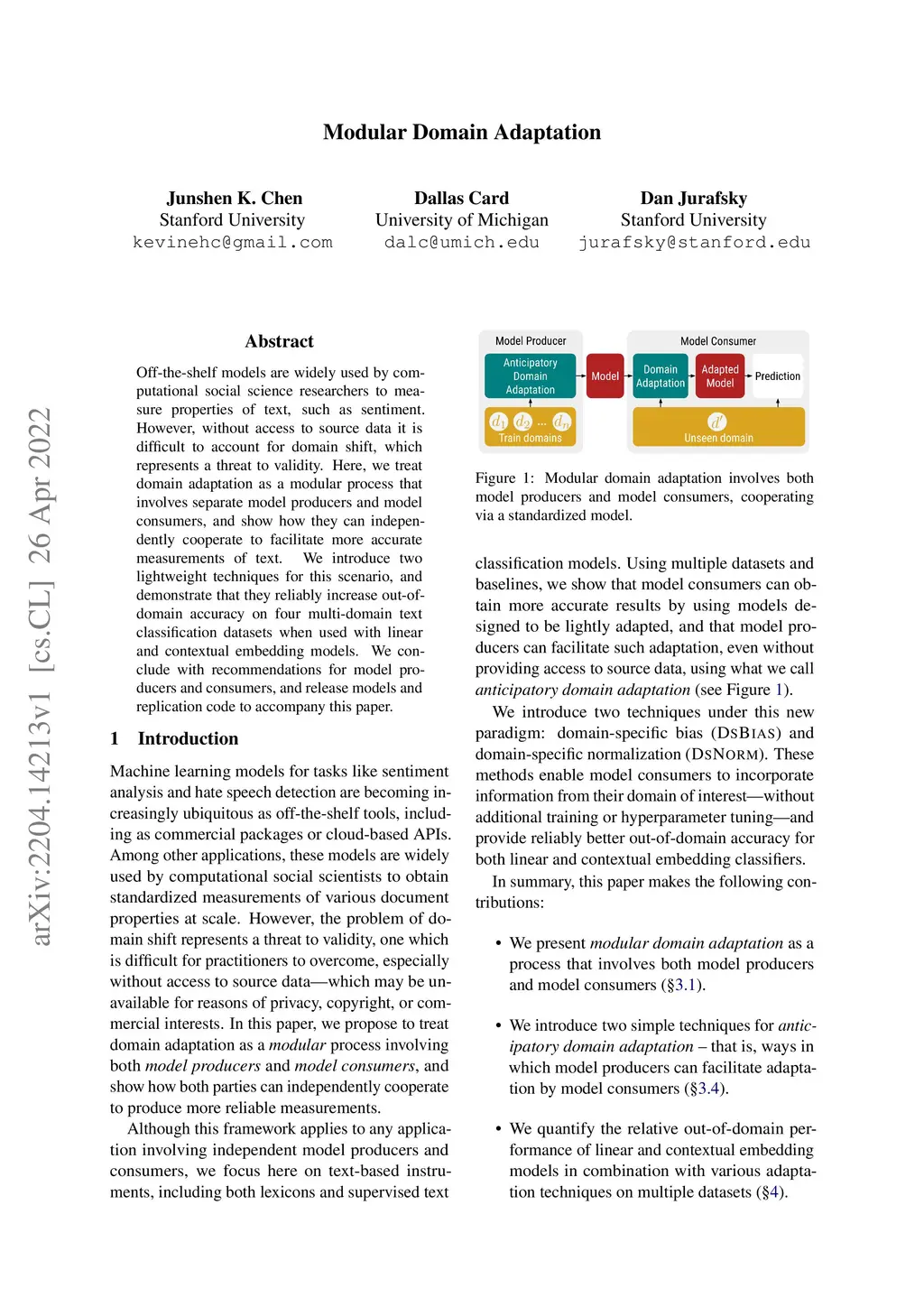 Off-the-shelf models are widely used by computational social science researchers to measure properties of text, such as sentiment. However, without access to source data it is difficult to account for domain shift, which represents a threat to validity. Here, we treat domain adaptation as a modular process that involves separate model producers and model consumers, and show how they can independently cooperate to facilitate more accurate measurements of text. We introduce two lightweight techniques for this scenario, and demonstrate that they reliably increase out-of-domain accuracy on four multi-domain text classification datasets when used with linear and contextual embedding models. We conclude with recommendations for model producers and consumers, and release models and replication code to accompany this paper.