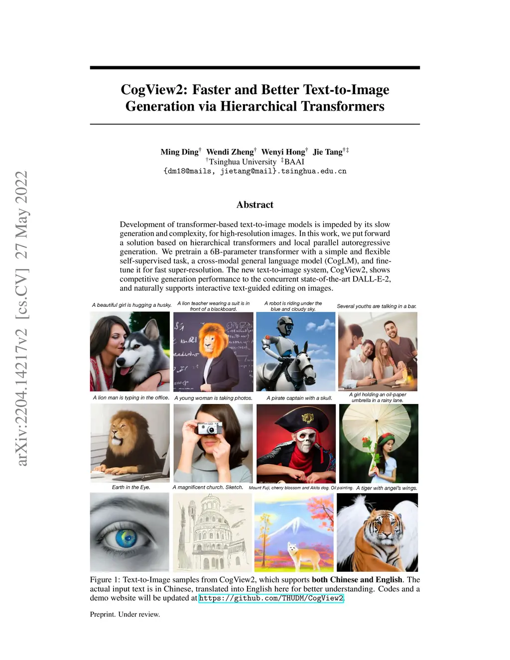CogView2: Faster and Better Text-to-Image Generation via Hierarchical