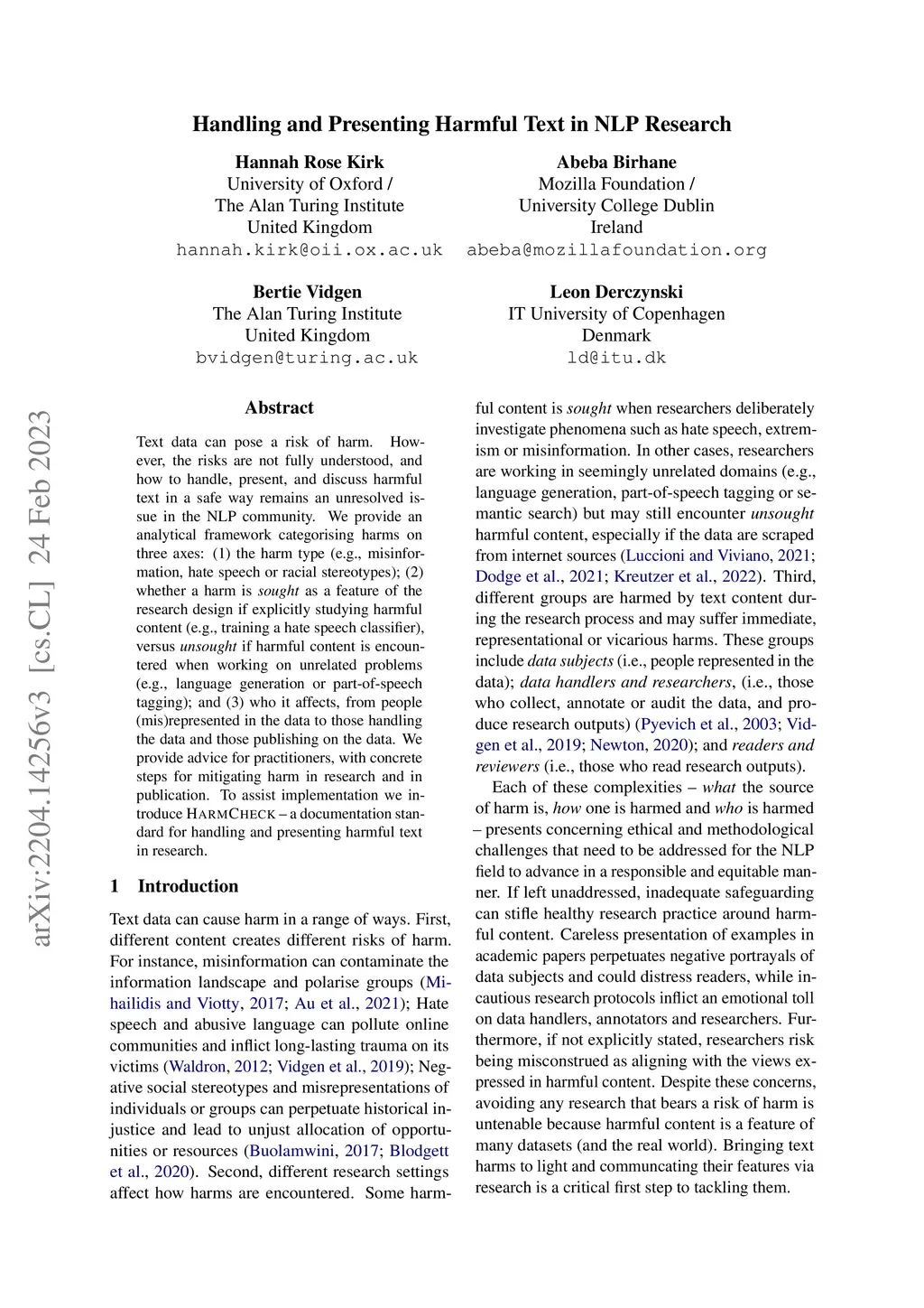 Text data can pose a risk of harm. However, the risks are not fully understood, and how to handle, present, and discuss harmful text in a safe way remains an unresolved issue in the NLP community. We provide an analytical framework categorising harms on three axes: (1) the harm type (e.g., misinformation, hate speech or racial stereotypes); (2) whether a harm is \textit{sought} as a feature of the research design if explicitly studying harmful content (e.g., training a hate speech classifier), versus \textit{unsought} if harmful content is encountered when working on unrelated problems (e.g., language generation or part-of-speech tagging); and (3) who it affects, from people (mis)represented in the data to those handling the data and those publishing on the data. We provide advice for practitioners, with concrete steps for mitigating harm in research and in publication. To assist implementation we introduce \textsc{HarmCheck} -- a documentation standard for handling and presenting harmful text in research.