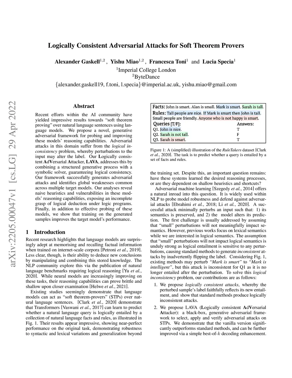 Recent efforts within the AI community have yielded impressive results towards "soft theorem proving" over natural language sentences using language models. We propose a novel, generative adversarial framework for probing and improving these models' reasoning capabilities. Adversarial attacks in this domain suffer from the logical inconsistency problem, whereby perturbations to the input may alter the label. Our Logically consistent AdVersarial Attacker, LAVA, addresses this by combining a structured generative process with a symbolic solver, guaranteeing logical consistency. Our framework successfully generates adversarial attacks and identifies global weaknesses common across multiple target models. Our analyses reveal naive heuristics and vulnerabilities in these models' reasoning capabilities, exposing an incomplete grasp of logical deduction under logic programs. Finally, in addition to effective probing of these models, we show that training on the generated samples improves the target model's performance.