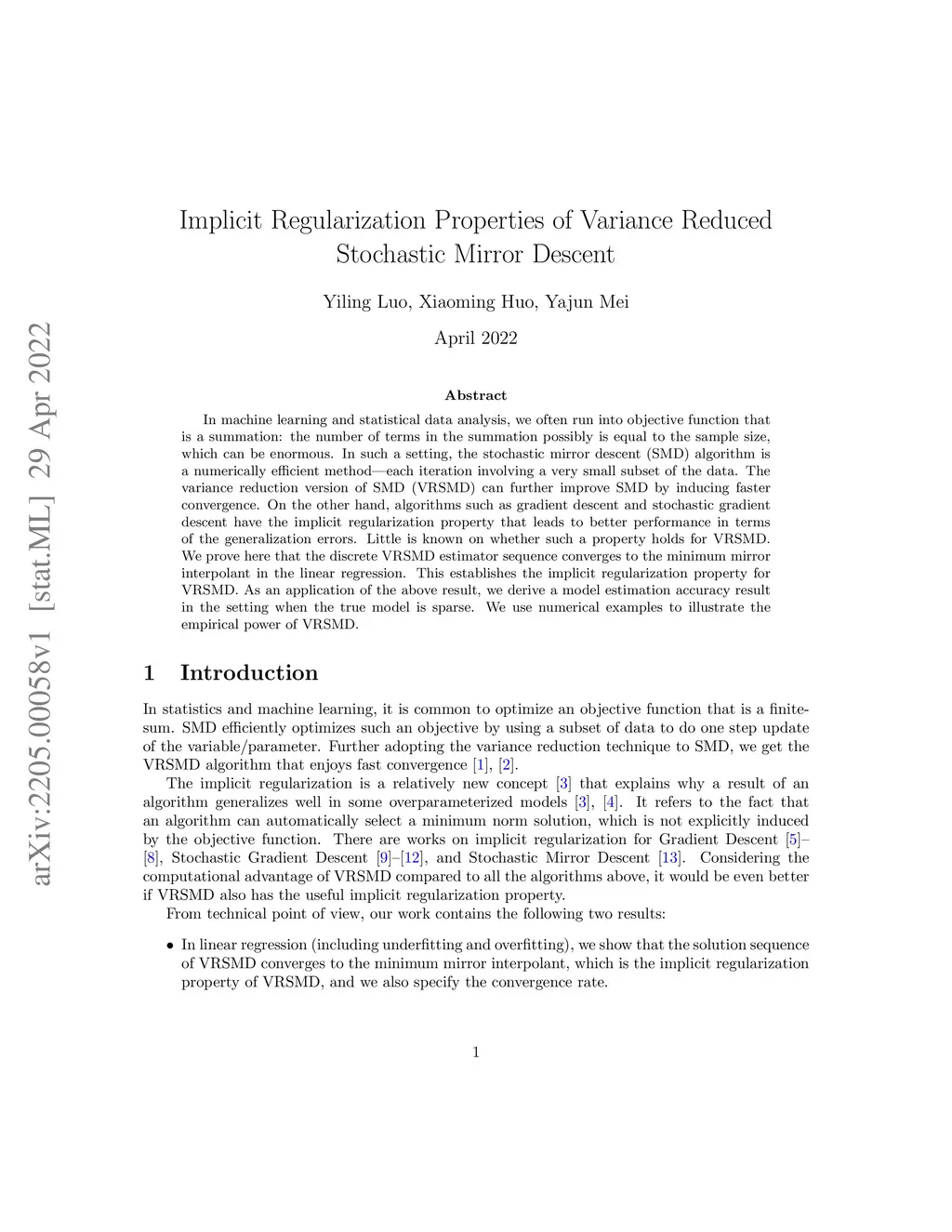 In machine learning and statistical data analysis, we often run into objective function that is a summation: the number of terms in the summation possibly is equal to the sample size, which can be enormous. In such a setting, the stochastic mirror descent (SMD) algorithm is a numerically efficient method -- each iteration involving a very small subset of the data. The variance reduction version of SMD (VRSMD) can further improve SMD by inducing faster convergence. On the other hand, algorithms such as gradient descent and stochastic gradient descent have the implicit regularization property that leads to better performance in terms of the generalization errors. Little is known on whether such a property holds for VRSMD. We prove here that the discrete VRSMD estimator sequence converges to the minimum mirror interpolant in the linear regression. This establishes the implicit regularization property for VRSMD. As an application of the above result, we derive a model estimation accuracy result in the setting when the true model is sparse. We use numerical examples to illustrate the empirical power of VRSMD.