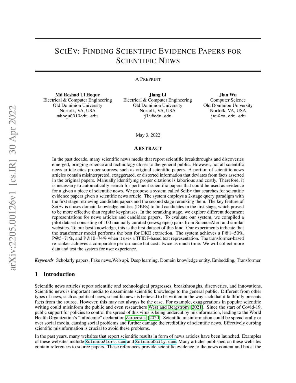 In the past decade, many scientific news media that report scientific breakthroughs and discoveries emerged, bringing science and technology closer to the general public. However, not all scientific news article cites proper sources, such as original scientific papers. A portion of scientific news articles contain misinterpreted, exaggerated, or distorted information that deviates from facts asserted in the original papers. Manually identifying proper citations is laborious and costly. Therefore, it is necessary to automatically search for pertinent scientific papers that could be used as evidence for a given piece of scientific news. We propose a system called SciEv that searches for scientific evidence papers given a scientific news article. The system employs a 2-stage query paradigm with the first stage retrieving candidate papers and the second stage reranking them. The key feature of SciEv is it uses domain knowledge entities (DKEs) to find candidates in the first stage, which proved to be more effective than regular keyphrases. In the reranking stage, we explore different document representations for news articles and candidate papers. To evaluate our system, we compiled a pilot dataset consisting of 100 manually curated (news,paper) pairs from ScienceAlert and similar websites. To our best knowledge, this is the first dataset of this kind. Our experiments indicate that the transformer model performs the best for DKE extraction. The system achieves a P@1=50%, P@5=71%, and P@10=74% when it uses a TFIDF-based text representation. The transformer-based re-ranker achieves a comparable performance but costs twice as much time. We will collect more data and test the system for user experience.