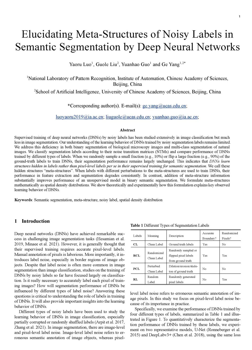 Supervised training of deep neural networks (DNNs) by noisy labels has been studied extensively in image classification but much less in image segmentation. Our understanding of the learning behavior of DNNs trained by noisy segmentation labels remains limited. We address this deficiency in both binary segmentation of biological microscopy images and multi-class segmentation of natural images. We classify segmentation labels according to their noise transition matrices (NTMs) and compare performance of DNNs trained by different types of labels. When we randomly sample a small fraction (e.g., 10%) or flip a large fraction (e.g., 90%) of the ground-truth labels to train DNNs, their segmentation performance remains largely unchanged. This indicates that DNNs learn structures hidden in labels rather than pixel-level labels per se in their supervised training for semantic segmentation. We call these hidden structures meta-structures. When labels with different perturbations to the meta-structures are used to train DNNs, their performance in feature extraction and segmentation degrades consistently. In contrast, addition of meta-structure information substantially improves performance of an unsupervised model in binary semantic segmentation. We formulate meta-structures mathematically as spatial density distributions. We show theoretically and experimentally how this formulation explains key observed learning behavior of DNNs.