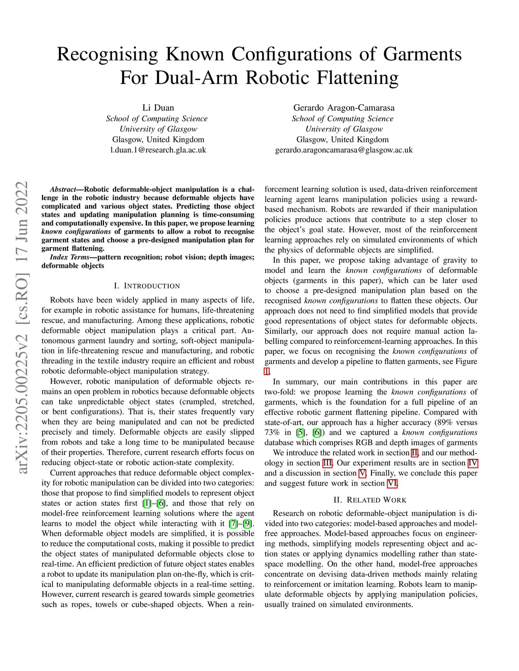 Recognising Known Configurations of Garments For Dual-Arm Robotic