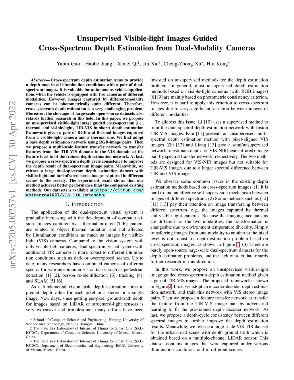 Cross-spectrum depth estimation aims to provide a depth map in all illumination conditions with a pair of dual-spectrum images. It is valuable for autonomous vehicle applications when the vehicle is equipped with two cameras of different modalities. However, images captured by different-modality cameras can be photometrically quite different. Therefore, cross-spectrum depth estimation is a very challenging problem. Moreover, the shortage of large-scale open-source datasets also retards further research in this field. In this paper, we propose an unsupervised visible-light image guided cross-spectrum (i.e., thermal and visible-light, TIR-VIS in short) depth estimation framework given a pair of RGB and thermal images captured from a visible-light camera and a thermal one. We first adopt a base depth estimation network using RGB-image pairs. Then we propose a multi-scale feature transfer network to transfer features from the TIR-VIS domain to the VIS domain at the feature level to fit the trained depth estimation network. At last, we propose a cross-spectrum depth cycle consistency to improve the depth result of dual-spectrum image pairs. Meanwhile, we release a large dual-spectrum depth estimation dataset with visible-light and far-infrared stereo images captured in different scenes to the society. The experiment result shows that our method achieves better performance than the compared existing methods. Our datasets is available at https://github.com/whitecrow1027/VIS-TIR-Datasets.
