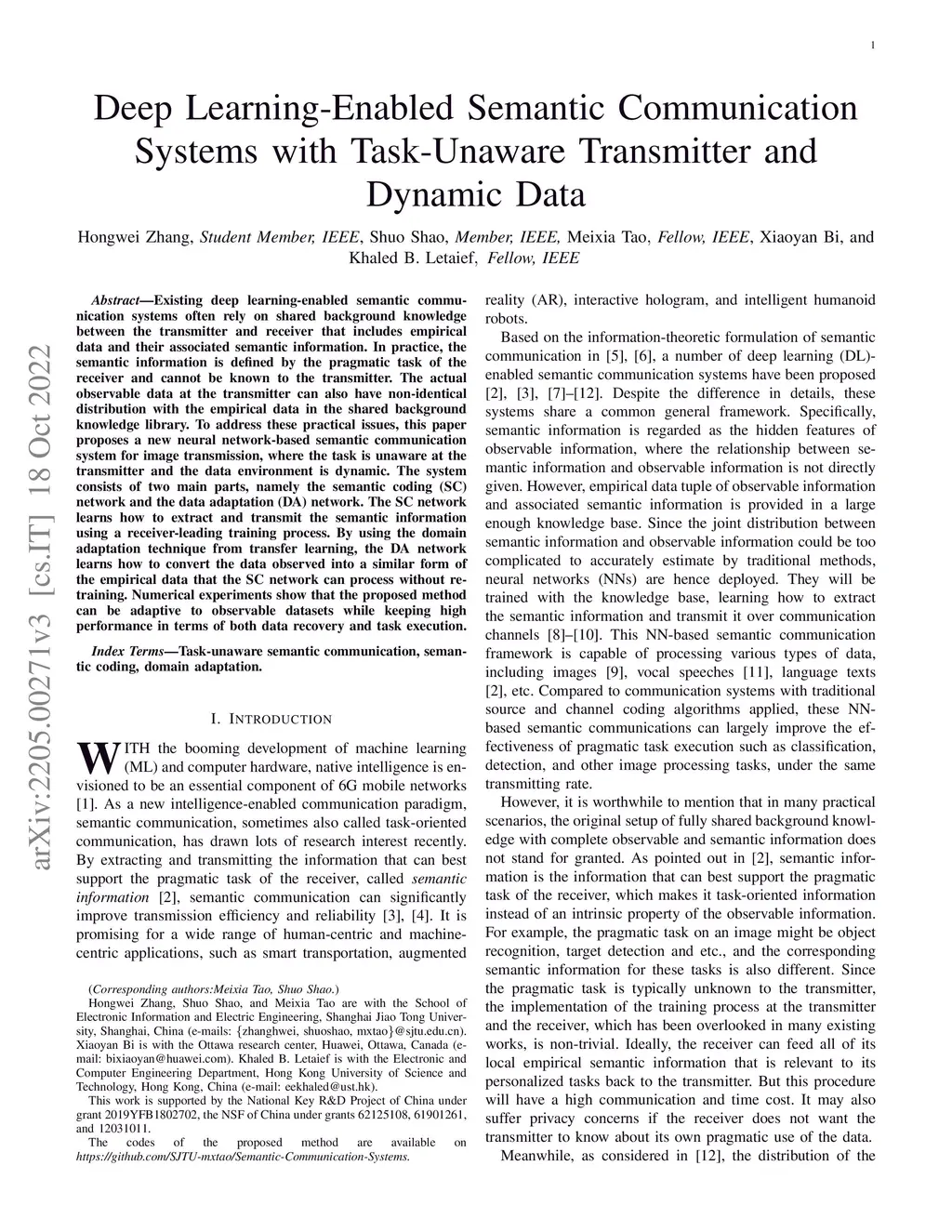 Existing deep learning-enabled semantic communication systems often rely on shared background knowledge between the transmitter and receiver that includes empirical data and their associated semantic information. In practice, the semantic information is defined by the pragmatic task of the receiver and cannot be known to the transmitter. The actual observable data at the transmitter can also have non-identical distribution with the empirical data in the shared background knowledge library. To address these practical issues, this paper proposes a new neural network-based semantic communication system for image transmission, where the task is unaware at the transmitter and the data environment is dynamic. The system consists of two main parts, namely the semantic coding (SC) network and the data adaptation (DA) network. The SC network learns how to extract and transmit the semantic information using a receiver-leading training process. By using the domain adaptation technique from transfer learning, the DA network learns how to convert the data observed into a similar form of the empirical data that the SC network can process without retraining. Numerical experiments show that the proposed method can be adaptive to observable datasets while keeping high performance in terms of both data recovery and task execution.