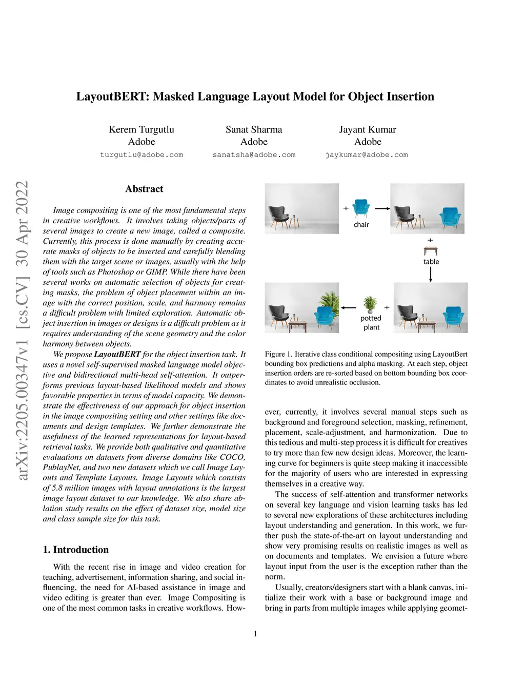 Image compositing is one of the most fundamental steps in creative workflows. It involves taking objects/parts of several images to create a new image, called a composite. Currently, this process is done manually by creating accurate masks of objects to be inserted and carefully blending them with the target scene or images, usually with the help of tools such as Photoshop or GIMP. While there have been several works on automatic selection of objects for creating masks, the problem of object placement within an image with the correct position, scale, and harmony remains a difficult problem with limited exploration. Automatic object insertion in images or designs is a difficult problem as it requires understanding of the scene geometry and the color harmony between objects. We propose LayoutBERT for the object insertion task. It uses a novel self-supervised masked language model objective and bidirectional multi-head self-attention. It outperforms previous layout-based likelihood models and shows favorable properties in terms of model capacity. We demonstrate the effectiveness of our approach for object insertion in the image compositing setting and other settings like documents and design templates. We further demonstrate the usefulness of the learned representations for layout-based retrieval tasks. We provide both qualitative and quantitative evaluations on datasets from diverse domains like COCO, PublayNet, and two new datasets which we call Image Layouts and Template Layouts. Image Layouts which consists of 5.8 million images with layout annotations is the largest image layout dataset to our knowledge. We also share ablation study results on the effect of dataset size, model size and class sample size for this task.