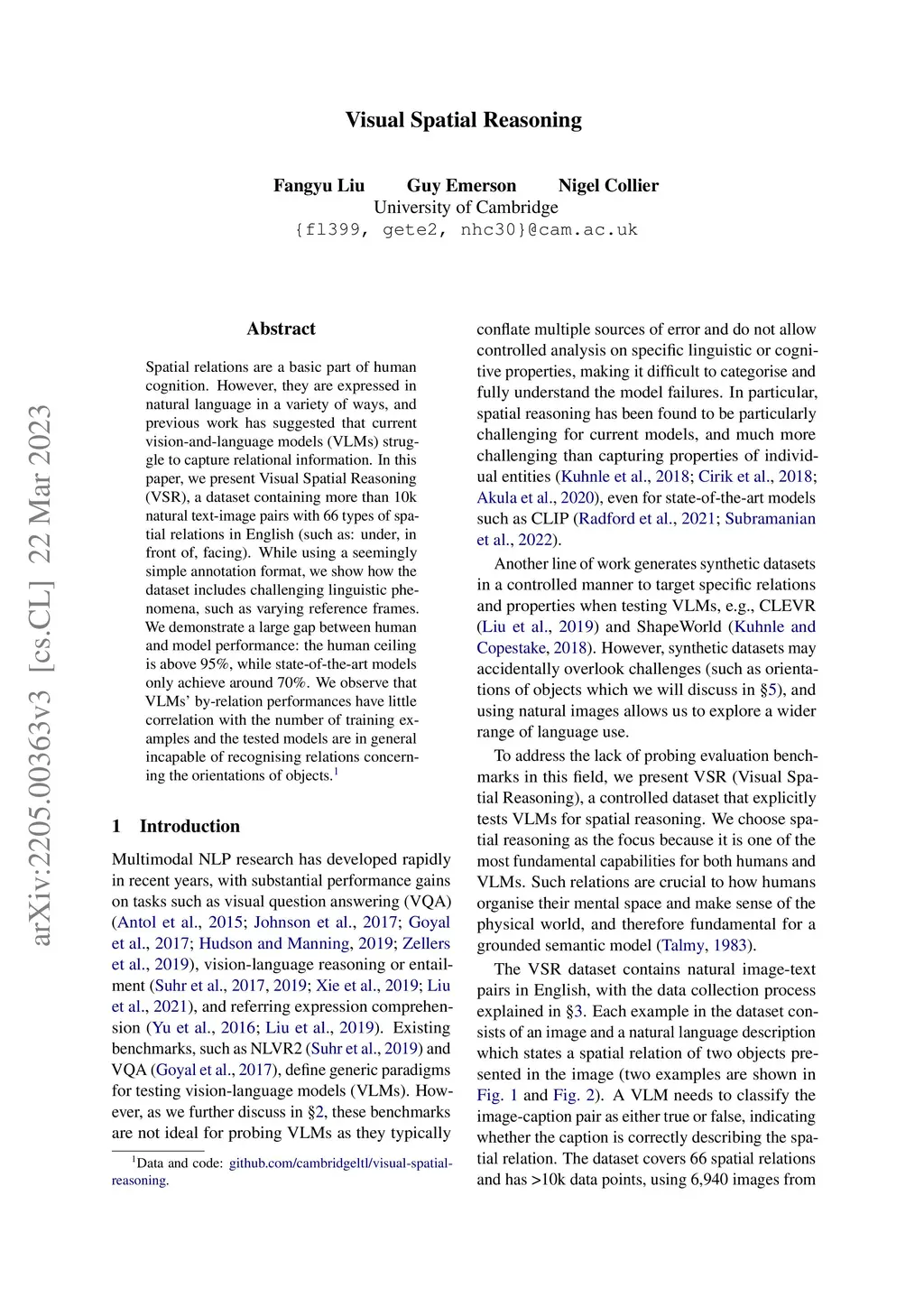 Spatial relations are a basic part of human cognition. However, they are expressed in natural language in a variety of ways, and previous work has suggested that current vision-and-language models (VLMs) struggle to capture relational information. In this paper, we present Visual Spatial Reasoning (VSR), a dataset containing more than 10k natural text-image pairs with 66 types of spatial relations in English (such as: under, in front of, and facing). While using a seemingly simple annotation format, we show how the dataset includes challenging linguistic phenomena, such as varying reference frames. We demonstrate a large gap between human and model performance: the human ceiling is above 95%, while state-of-the-art models only achieve around 70%. We observe that VLMs' by-relation performances have little correlation with the number of training examples and the tested models are in general incapable of recognising relations concerning the orientations of objects.