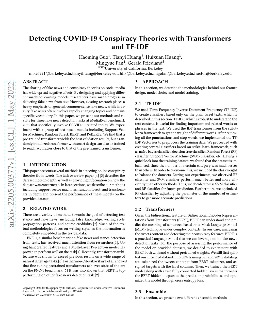 The sharing of fake news and conspiracy theories on social media has wide-spread negative effects. By designing and applying different machine learning models, researchers have made progress in detecting fake news from text. However, existing research places a heavy emphasis on general, common-sense fake news, while in reality fake news often involves rapidly changing topics and domain-specific vocabulary. In this paper, we present our methods and results for three fake news detection tasks at MediaEval benchmark 2021 that specifically involve COVID-19 related topics. We experiment with a group of text-based models including Support Vector Machines, Random Forest, BERT, and RoBERTa. We find that a pre-trained transformer yields the best validation results, but a randomly initialized transformer with smart design can also be trained to reach accuracies close to that of the pre-trained transformer.