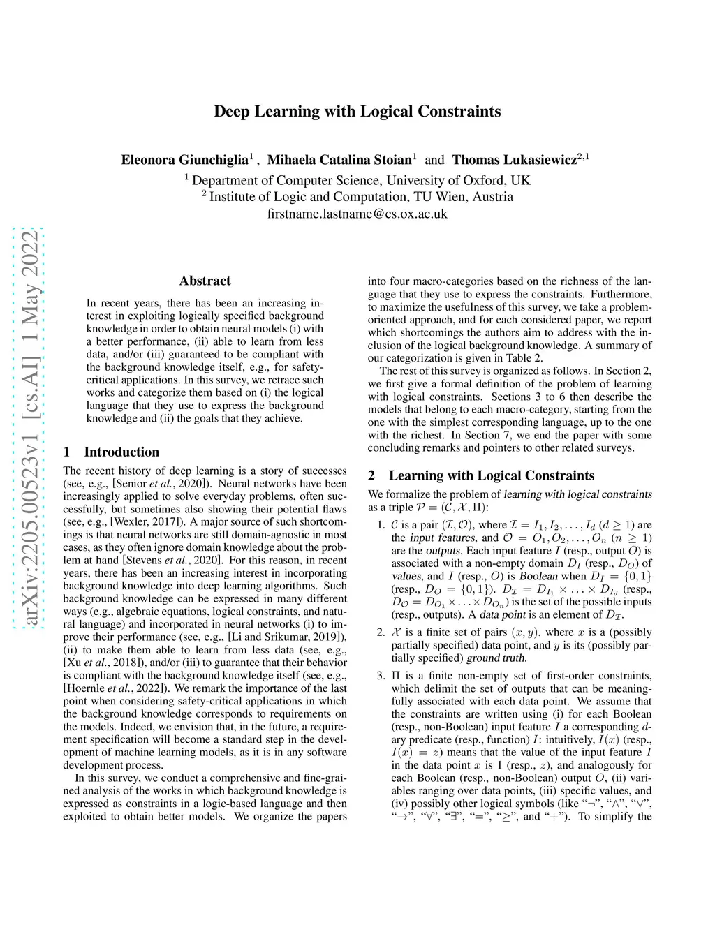 In recent years, there has been an increasing interest in exploiting logically specified background knowledge in order to obtain neural models (i) with a better performance, (ii) able to learn from less data, and/or (iii) guaranteed to be compliant with the background knowledge itself, e.g., for safety-critical applications. In this survey, we retrace such works and categorize them based on (i) the logical language that they use to express the background knowledge and (ii) the goals that they achieve.