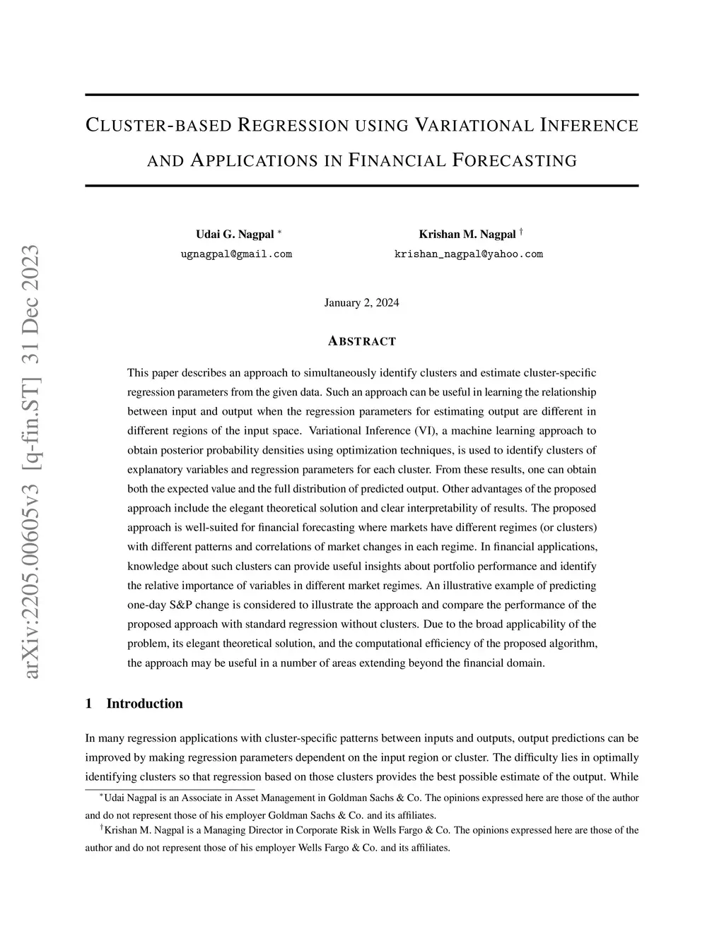 This paper describes an approach to simultaneously identify clusters and estimate cluster-specific regression parameters from the given data. Such an approach can be useful in learning the relationship between input and output when the regression parameters for estimating output are different in different regions of the input space. Variational Inference (VI), a machine learning approach to obtain posterior probability densities using optimization techniques, is used to identify clusters of explanatory variables and regression parameters for each cluster. From these results, one can obtain both the expected value and the full distribution of predicted output. Other advantages of the proposed approach include the elegant theoretical solution and clear interpretability of results. The proposed approach is well-suited for financial forecasting where markets have different regimes (or clusters) with different patterns and correlations of market changes in each regime. In financial applications, knowledge about such clusters can provide useful insights about portfolio performance and identify the relative importance of variables in different market regimes. An illustrative example of predicting one-day S&P change is considered to illustrate the approach and compare the performance of the proposed approach with standard regression without clusters. Due to the broad applicability of the problem, its elegant theoretical solution, and the computational efficiency of the proposed algorithm, the approach may be useful in a number of areas extending beyond the financial domain.