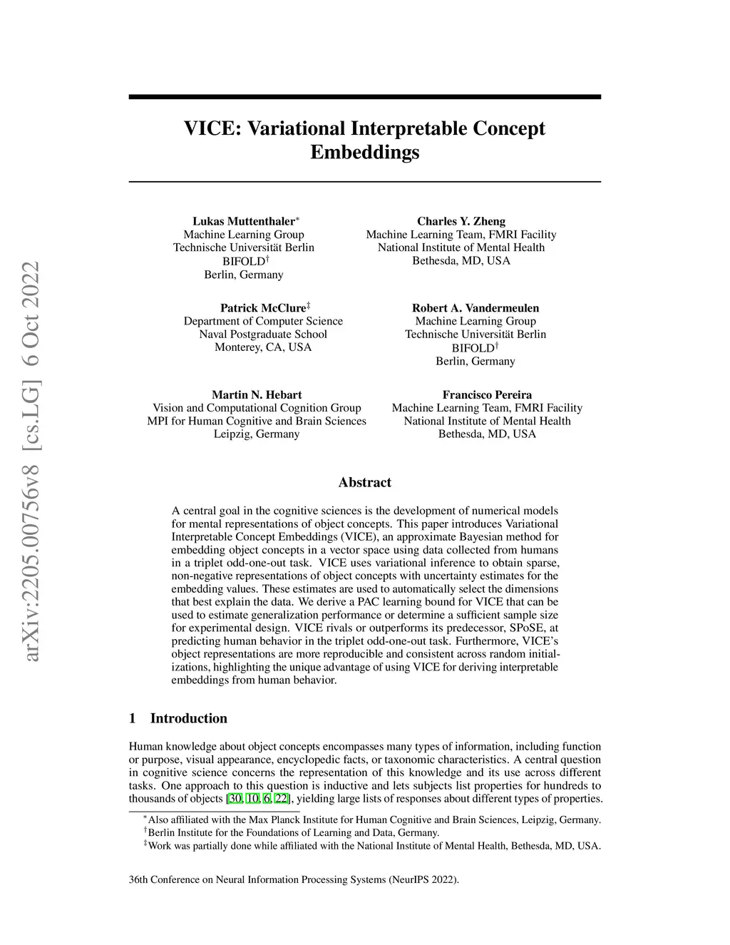 A central goal in the cognitive sciences is the development of numerical models for mental representations of object concepts. This paper introduces Variational Interpretable Concept Embeddings (VICE), an approximate Bayesian method for embedding object concepts in a vector space using data collected from humans in a triplet odd-one-out task. VICE uses variational inference to obtain sparse, non-negative representations of object concepts with uncertainty estimates for the embedding values. These estimates are used to automatically select the dimensions that best explain the data. We derive a PAC learning bound for VICE that can be used to estimate generalization performance or determine a sufficient sample size for experimental design. VICE rivals or outperforms its predecessor, SPoSE, at predicting human behavior in the triplet odd-one-out task. Furthermore, VICE's object representations are more reproducible and consistent across random initializations, highlighting the unique advantage of using VICE for deriving interpretable embeddings from human behavior.