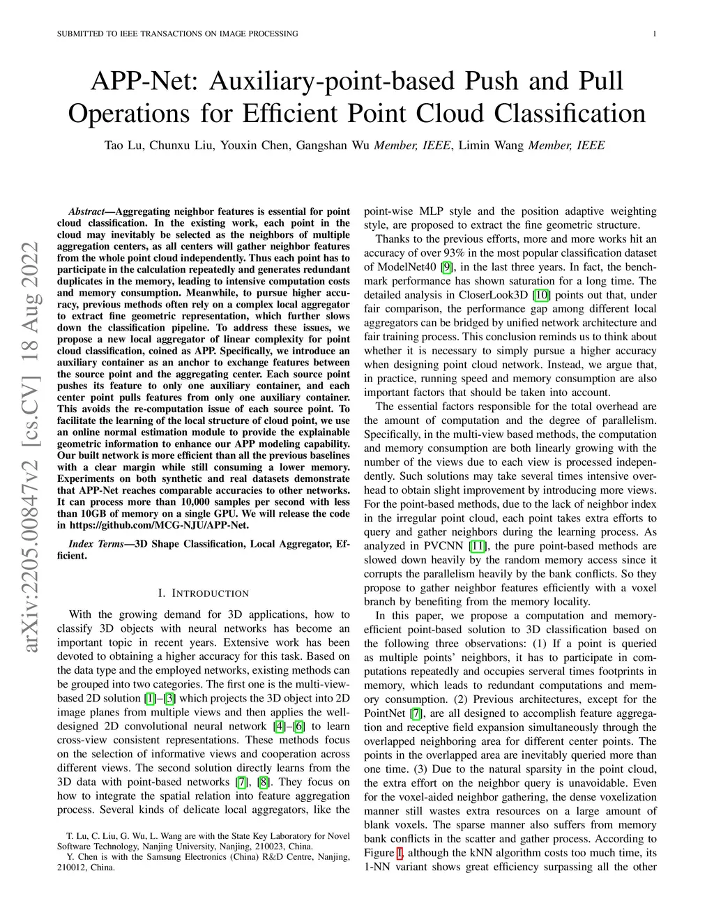 Aggregating neighbor features is essential for point cloud classification. In the existing work, each point in the cloud may inevitably be selected as the neighbors of multiple aggregation centers, as all centers will gather neighbor features from the whole point cloud independently. Thus each point has to participate in the calculation repeatedly and generates redundant duplicates in the memory, leading to intensive computation costs and memory consumption. Meanwhile, to pursue higher accuracy, previous methods often rely on a complex local aggregator to extract fine geometric representation, which further slows down the classification pipeline. To address these issues, we propose a new local aggregator of linear complexity for point cloud classification, coined as APP. Specifically, we introduce an auxiliary container as an anchor to exchange features between the source point and the aggregating center. Each source point pushes its feature to only one auxiliary container, and each center point pulls features from only one auxiliary container. This avoids the re-computation issue of each source point. To facilitate the learning of the local structure of cloud point, we use an online normal estimation module to provide the explainable geometric information to enhance our APP modeling capability. Our built network is more efficient than all the previous baselines with a clear margin while still consuming a lower memory. Experiments on both synthetic and real datasets demonstrate that APP-Net reaches comparable accuracies to other networks. It can process more than 10,000 samples per second with less than 10GB of memory on a single GPU. We will release the code in https://github.com/MCG-NJU/APP-Net.