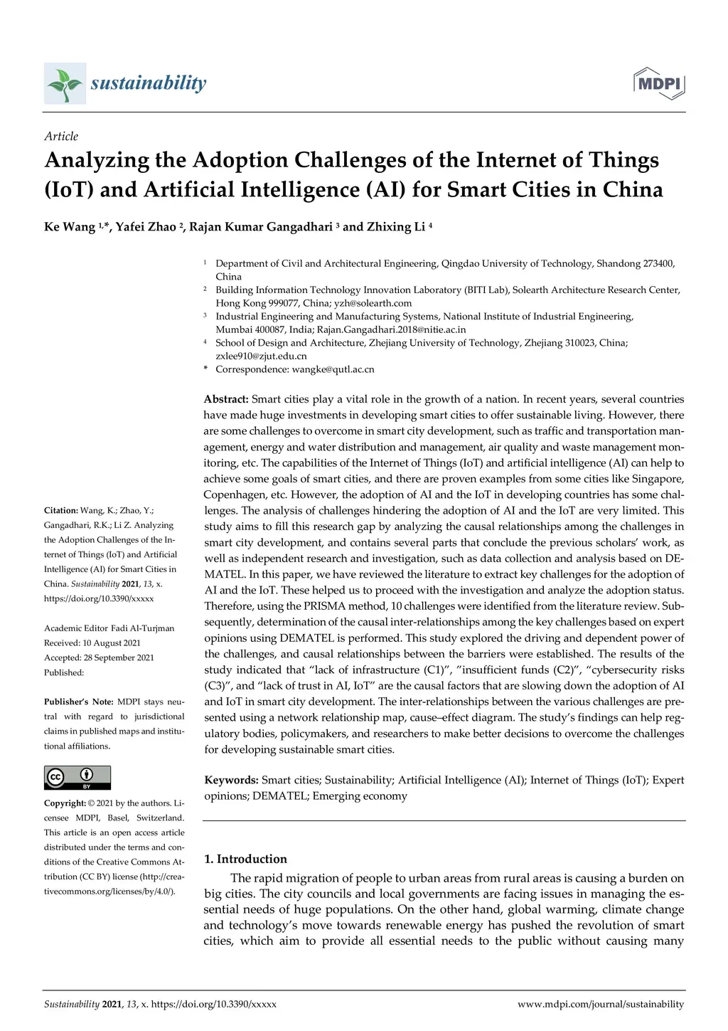 Smart cities play a vital role in the growth of a nation. In recent years, several countries have made huge investments in developing smart cities to offer sustainable living. However, there are some challenges to overcome in smart city development, such as traffic and transportation man-agement, energy and water distribution and management, air quality and waste management monitoring, etc. The capabilities of the Internet of Things (IoT) and artificial intelligence (AI) can help to achieve some goals of smart cities, and there are proven examples from some cities like Singapore, Copenhagen, etc. However, the adoption of AI and the IoT in developing countries has some challenges. The analysis of challenges hindering the adoption of AI and the IoT are very limited. This study aims to fill this research gap by analyzing the causal relationships among the challenges in smart city development, and contains several parts that conclude the previous scholars work, as well as independent research and investigation, such as data collection and analysis based on DEMATEL. In this paper, we have reviewed the literature to extract key chal-lenges for the adoption of AI and the IoT. These helped us to proceed with the investigation and analyze the adoption status. Therefore, using the PRISMA method, 10 challenges were identified from the literature review. Subsequently, determination of the causal inter-relationships among the key challenges based on expert opinions using DEMATEL is performed. This study explored the driving and dependent power of the challenges, and causal relationships between the barriers were established.