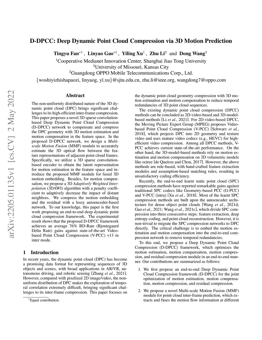 D-DPCC: Deep Dynamic Point Cloud Compression via 3D Motion Prediction