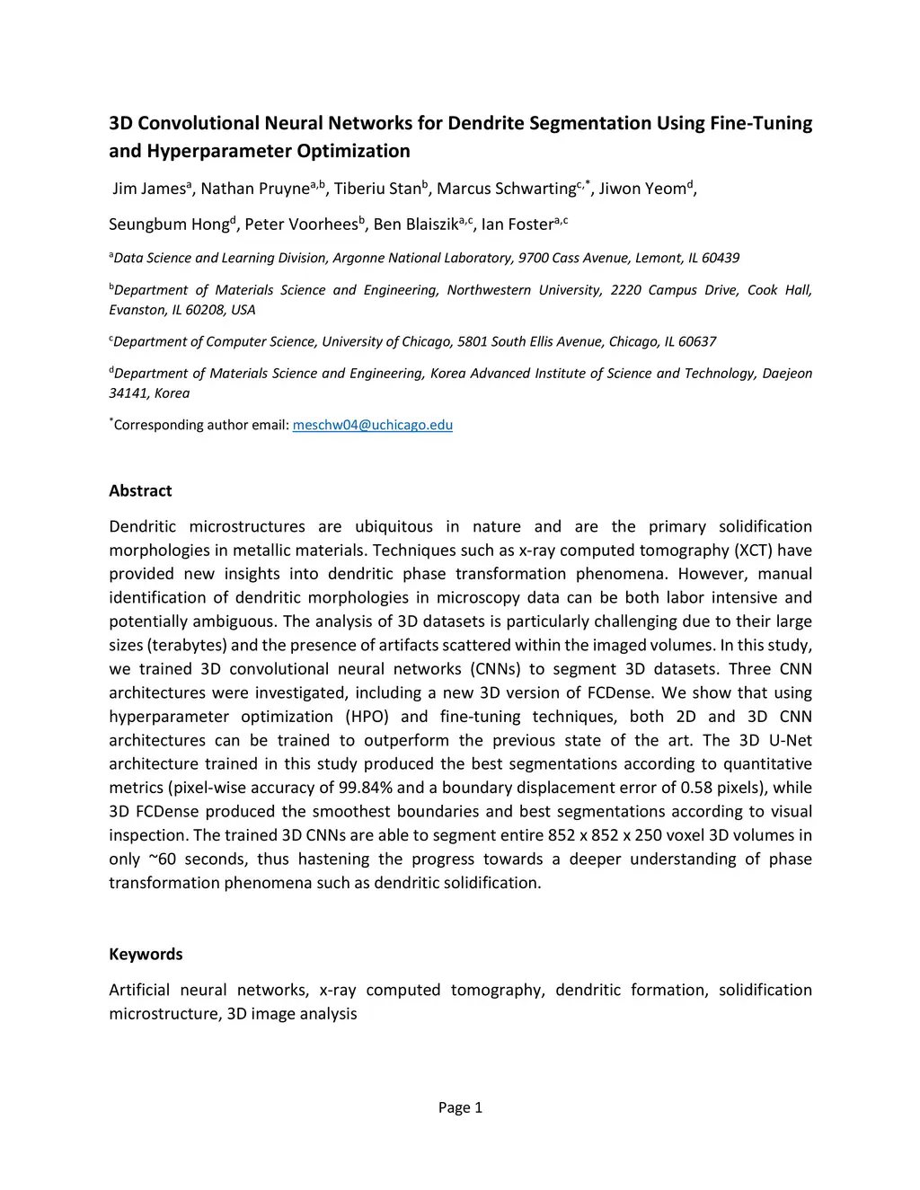 Dendritic microstructures are ubiquitous in nature and are the primary solidification morphologies in metallic materials. Techniques such as x-ray computed tomography (XCT) have provided new insights into dendritic phase transformation phenomena. However, manual identification of dendritic morphologies in microscopy data can be both labor intensive and potentially ambiguous. The analysis of 3D datasets is particularly challenging due to their large sizes (terabytes) and the presence of artifacts scattered within the imaged volumes. In this study, we trained 3D convolutional neural networks (CNNs) to segment 3D datasets. Three CNN architectures were investigated, including a new 3D version of FCDense. We show that using hyperparameter optimization (HPO) and fine-tuning techniques, both 2D and 3D CNN architectures can be trained to outperform the previous state of the art. The 3D U-Net architecture trained in this study produced the best segmentations according to quantitative metrics (pixel-wise accuracy of 99.84% and a boundary displacement error of 0.58 pixels), while 3D FCDense produced the smoothest boundaries and best segmentations according to visual inspection. The trained 3D CNNs are able to segment entire 852 x 852 x 250 voxel 3D volumes in only ~60 seconds, thus hastening the progress towards a deeper understanding of phase transformation phenomena such as dendritic solidification.