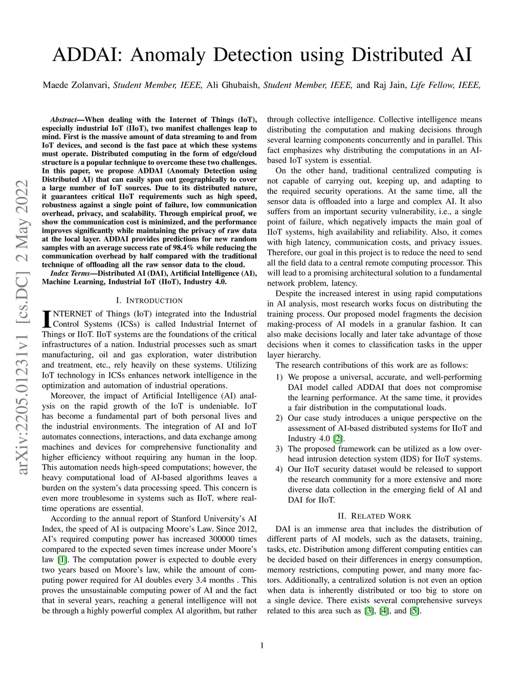 When dealing with the Internet of Things (IoT), especially industrial IoT (IIoT), two manifest challenges leap to mind. First is the massive amount of data streaming to and from IoT devices, and second is the fast pace at which these systems must operate. Distributed computing in the form of edge/cloud structure is a popular technique to overcome these two challenges. In this paper, we propose ADDAI (Anomaly Detection using Distributed AI) that can easily span out geographically to cover a large number of IoT sources. Due to its distributed nature, it guarantees critical IIoT requirements such as high speed, robustness against a single point of failure, low communication overhead, privacy, and scalability. Through empirical proof, we show the communication cost is minimized, and the performance improves significantly while maintaining the privacy of raw data at the local layer. ADDAI provides predictions for new random samples with an average success rate of 98.4% while reducing the communication overhead by half compared with the traditional technique of offloading all the raw sensor data to the cloud.