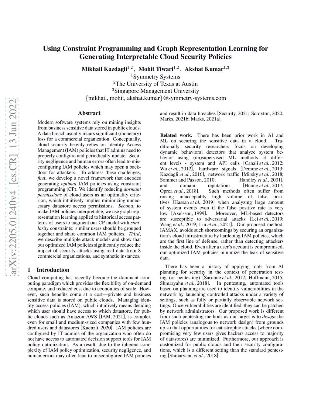 Modern software systems rely on mining insights from business sensitive data stored in public clouds. A data breach usually incurs significant (monetary) loss for a commercial organization. Conceptually, cloud security heavily relies on Identity Access Management (IAM) policies that IT admins need to properly configure and periodically update. Security negligence and human errors often lead to misconfiguring IAM policies which may open a backdoor for attackers. To address these challenges, first, we develop a novel framework that encodes generating optimal IAM policies using constraint programming (CP). We identify reducing dark permissions of cloud users as an optimality criterion, which intuitively implies minimizing unnecessary datastore access permissions. Second, to make IAM policies interpretable, we use graph representation learning applied to historical access patterns of users to augment our CP model with similarity constraints: similar users should be grouped together and share common IAM policies. Third, we describe multiple attack models and show that our optimized IAM policies significantly reduce the impact of security attacks using real data from 8 commercial organizations, and synthetic instances.
