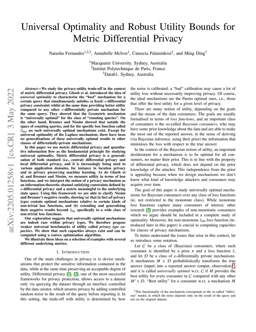 We study the privacy-utility trade-off in the context of metric differential privacy. Ghosh et al. introduced the idea of universal optimality to characterise the best mechanism for a certain query that simultaneously satisfies (a fixed) -differential privacy constraint whilst at the same time providing better utility compared to any other -differentially private mechanism for the same query. They showed that the Geometric mechanism is "universally optimal" for the class of counting queries. On the other hand, Brenner and Nissim showed that outside the space of counting queries, and for the Bayes risk loss function, no such universally optimal mechanisms exist. In this paper we use metric differential privacy and quantitative information flow as the fundamental principle for studying universal optimality. Metric differential privacy is a generalisation of both standard (i.e., central) differential privacy and local differential privacy, and it is increasingly being used in various application domains, for instance in location privacy and in privacy preserving machine learning. Using this framework we are able to clarify Nissim and Brenner's negative results, showing (a) that in fact all privacy types contain optimal mechanisms relative to certain kinds of non-trivial loss functions, and (b) extending and generalising their negative results beyond Bayes risk specifically to a wide class of non-trivial loss functions. We also propose weaker universal benchmarks of utility called "privacy type capacities". We show that such capacities always exist and can be computed using a convex optimisation algorithm.