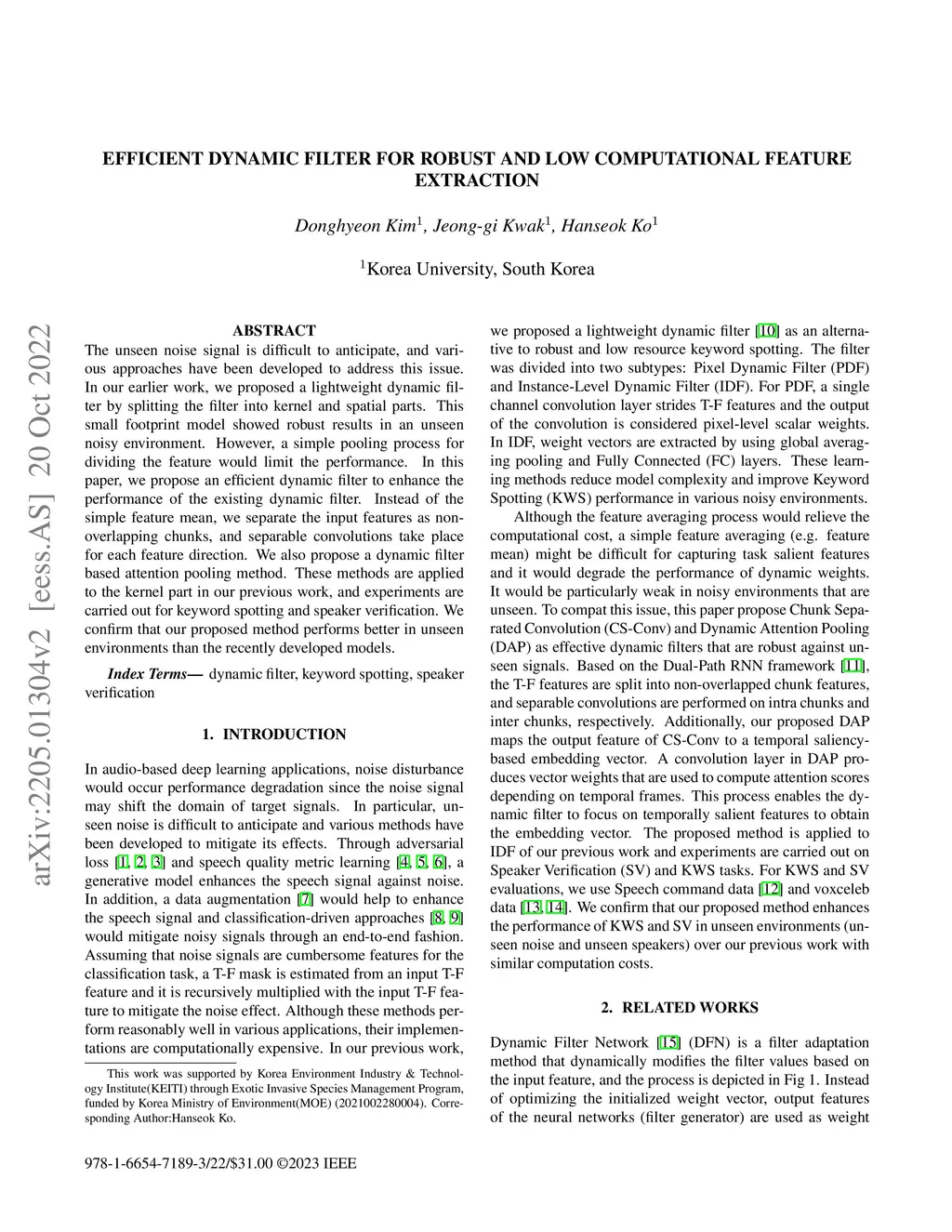 Unseen noise signal which is not considered in a model training process is difficult to anticipate and would lead to performance degradation. Various methods have been investigated to mitigate unseen noise. In our previous work, an Instance-level Dynamic Filter (IDF) and a Pixel Dynamic Filter (PDF) were proposed to extract noise-robust features. However, the performance of the dynamic filter might be degraded since simple feature pooling is used to reduce the computational resource in the IDF part. In this paper, we propose an efficient dynamic filter to enhance the performance of the dynamic filter. Instead of utilizing the simple feature mean, we separate Time-Frequency (T-F) features as non-overlapping chunks, and separable convolutions are carried out for each feature direction (inter chunks and intra chunks). Additionally, we propose Dynamic Attention Pooling that maps high dimensional features as low dimensional feature embeddings. These methods are applied to the IDF for keyword spotting and speaker verification tasks. We confirm that our proposed method performs better in unseen environments (unseen noise and unseen speakers) than state-of-the-art models.