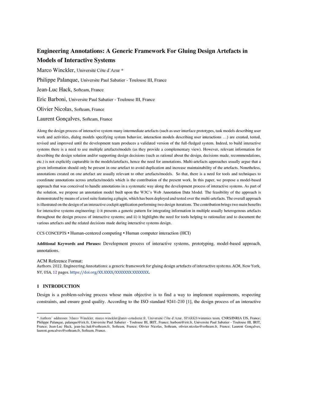 Along the design process of interactive system many intermediate artefacts (such as user interface prototypes, task models describing user work and activities, dialog models specifying system behavior, interaction models describing user interactions {\ldots}) are created, tested, revised and improved until the development team produces a validated version of the full-fledged system. Indeed, to build interactive systems there is a need to use multiple artefacts/models (as they provide a complementary view). However, relevant information for describing the design solution and/or supporting design decisions (such as rational about the design, decisions made, recommendations, etc.) is not explicitly capturable in the models/artefacts, hence the need for annotations. Multi-artefacts approaches usually argue that a given information should only be present in one artefact to avoid duplication and increase maintainability of the artefacts. Nonetheless, annotations created on one artefact are usually relevant to other artefacts/models. So that, there is a need for tools and techniques to coordinate annotations across artefacts/models which is the contribution of the present work. In this paper, we propose a model-based approach that was conceived to handle annotations in a systematic way along the development process of interactive systems. As part of the solution, we propose an annotation model built upon the W3C's Web Annotation Data Model. The feasibility of the approach is demonstrated by means of a tool suite featuring a plugin, which has been deployed and tested over the multi-artefacts. The overall approach is illustrated on the design of an interactive cockpit application performing two design iterations. The contribution brings two main benefits for interactive systems engineering: i) it presents a generic pattern for integrating information in multiple usually heterogenous artefacts throughout the design process of interactive systems; and ii) it highlights the need for tools helping to rationalize and to document the various artefacts and the related decisions made during interactive systems design. CCS CONCEPTS Human-centered computing Human computer interaction (HCI)