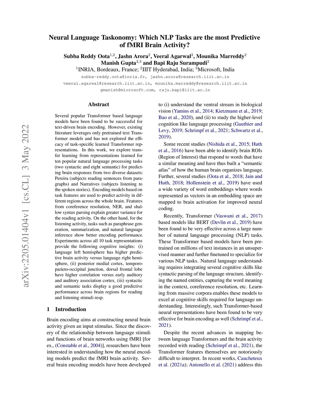 Several popular Transformer based language models have been found to be successful for text-driven brain encoding. However, existing literature leverages only pretrained text Transformer models and has not explored the efficacy of task-specific learned Transformer representations. In this work, we explore transfer learning from representations learned for ten popular natural language processing tasks (two syntactic and eight semantic) for predicting brain responses from two diverse datasets: Pereira (subjects reading sentences from paragraphs) and Narratives (subjects listening to the spoken stories). Encoding models based on task features are used to predict activity in different regions across the whole brain. Features from coreference resolution, NER, and shallow syntax parsing explain greater variance for the reading activity. On the other hand, for the listening activity, tasks such as paraphrase generation, summarization, and natural language inference show better encoding performance. Experiments across all 10 task representations provide the following cognitive insights: (i) language left hemisphere has higher predictive brain activity versus language right hemisphere, (ii) posterior medial cortex, temporo-parieto-occipital junction, dorsal frontal lobe have higher correlation versus early auditory and auditory association cortex, (iii) syntactic and semantic tasks display a good predictive performance across brain regions for reading and listening stimuli resp.