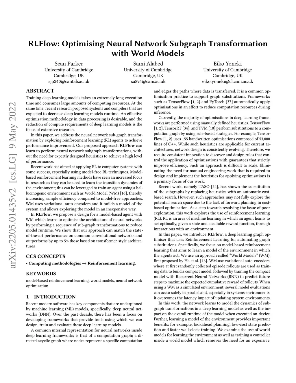 Training deep learning models takes an extremely long execution time and consumes large amounts of computing resources. At the same time, recent research proposed systems and compilers that are expected to decrease deep learning models runtime. An effective optimisation methodology in data processing is desirable, and the reduction of compute requirements of deep learning models is the focus of extensive research. In this paper, we address the neural network sub-graph transformation by exploring reinforcement learning (RL) agents to achieve performance improvement. Our proposed approach RLFlow can learn to perform neural network subgraph transformations, without the need for expertly designed heuristics to achieve a high level of performance. Recent work has aimed at applying RL to computer systems with some success, especially using model-free RL techniques. Model-based reinforcement learning methods have seen an increased focus in research as they can be used to learn the transition dynamics of the environment; this can be leveraged to train an agent using a hallucinogenic environment such as World Model (WM), thereby increasing sample efficiency compared to model-free approaches. WM uses variational auto-encoders and it builds a model of the system and allows exploring the model in an inexpensive way. In RLFlow, we propose a design for a model-based agent with WM which learns to optimise the architecture of neural networks by performing a sequence of sub-graph transformations to reduce model runtime. We show that our approach can match the state-of-the-art performance on common convolutional networks and outperforms by up to 5% those based on transformer-style architectures