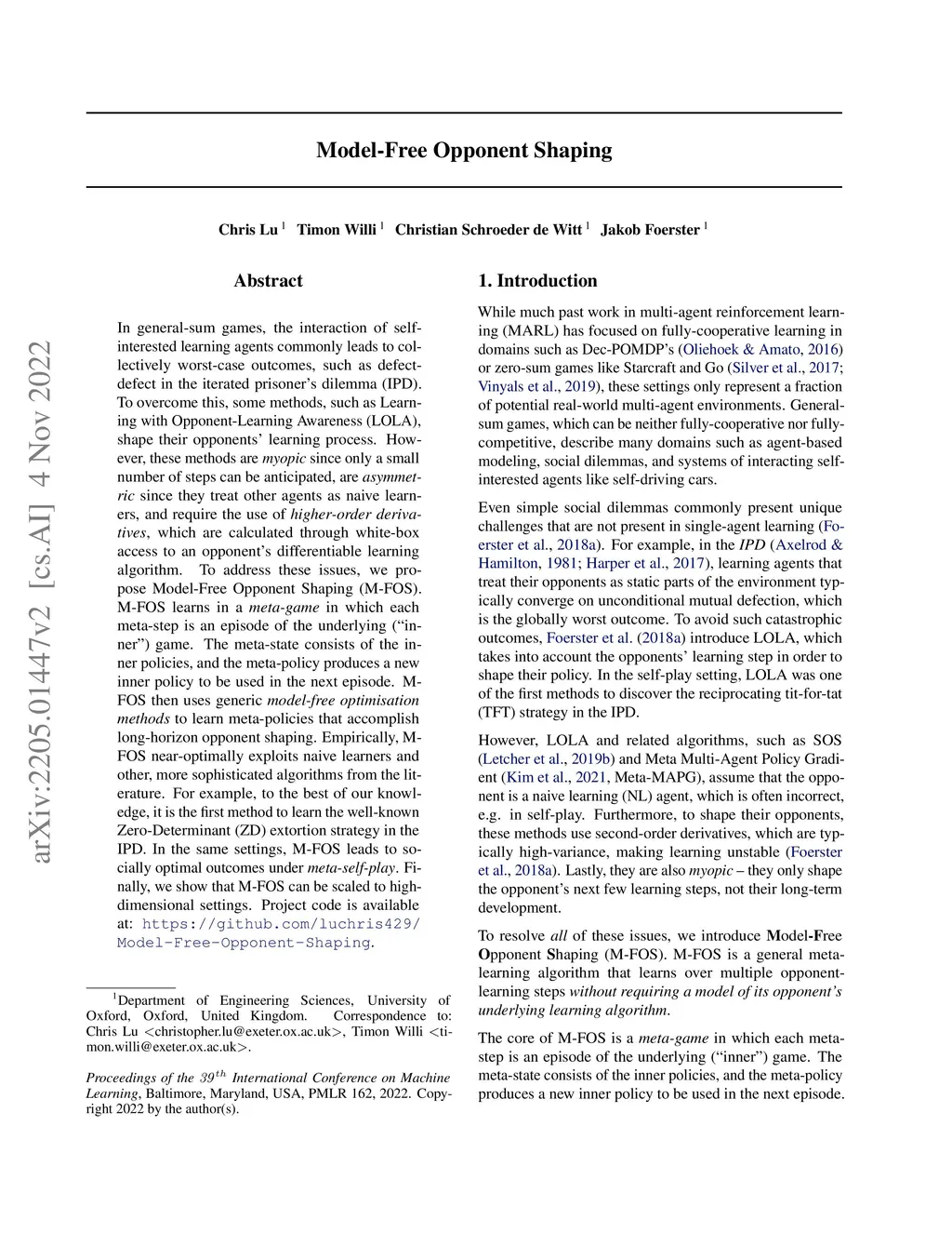 In general-sum games, the interaction of self-interested learning agents commonly leads to collectively worst-case outcomes, such as defect-defect in the iterated prisoner's dilemma (IPD). To overcome this, some methods, such as Learning with Opponent-Learning Awareness (LOLA), shape their opponents' learning process. However, these methods are myopic since only a small number of steps can be anticipated, are asymmetric since they treat other agents as naive learners, and require the use of higher-order derivatives, which are calculated through white-box access to an opponent's differentiable learning algorithm. To address these issues, we propose Model-Free Opponent Shaping (M-FOS). M-FOS learns in a meta-game in which each meta-step is an episode of the underlying inner game. The meta-state consists of the inner policies, and the meta-policy produces a new inner policy to be used in the next episode. M-FOS then uses generic model-free optimisation methods to learn meta-policies that accomplish long-horizon opponent shaping. Empirically, M-FOS near-optimally exploits naive learners and other, more sophisticated algorithms from the literature. For example, to the best of our knowledge, it is the first method to learn the well-known Zero-Determinant (ZD) extortion strategy in the IPD. In the same settings, M-FOS leads to socially optimal outcomes under meta-self-play. Finally, we show that M-FOS can be scaled to high-dimensional settings.