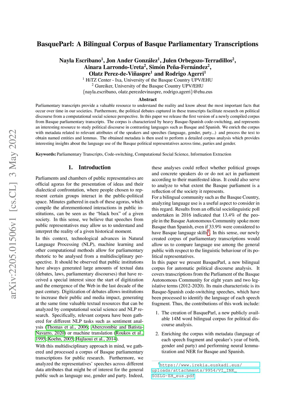 Parliamentary transcripts provide a valuable resource to understand the reality and know about the most important facts that occur over time in our societies. Furthermore, the political debates captured in these transcripts facilitate research on political discourse from a computational social science perspective. In this paper we release the first version of a newly compiled corpus from Basque parliamentary transcripts. The corpus is characterized by heavy Basque-Spanish code-switching, and represents an interesting resource to study political discourse in contrasting languages such as Basque and Spanish. We enrich the corpus with metadata related to relevant attributes of the speakers and speeches (language, gender, party...) and process the text to obtain named entities and lemmas. The obtained metadata is then used to perform a detailed corpus analysis which provides interesting insights about the language use of the Basque political representatives across time, parties and gender.