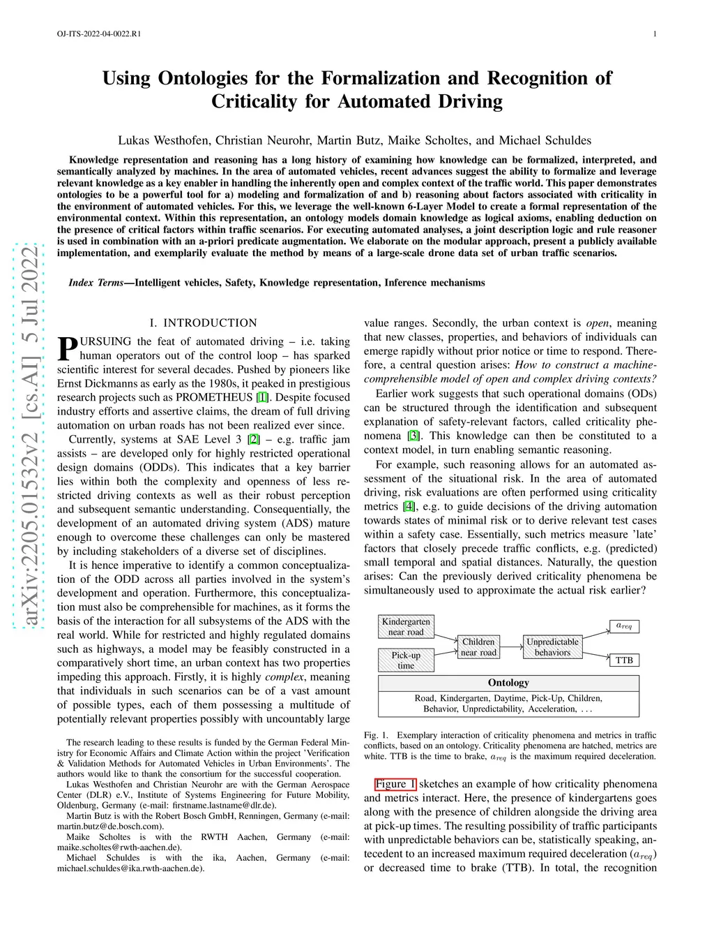 Knowledge representation and reasoning has a long history of examining how knowledge can be formalized, interpreted, and semantically analyzed by machines. In the area of automated vehicles, recent advances suggest the ability to formalize and leverage relevant knowledge as a key enabler in handling the inherently open and complex context of the traffic world. This paper demonstrates ontologies to be a powerful tool for a) modeling and formalization of and b) reasoning about factors associated with criticality in the environment of automated vehicles. For this, we leverage the well-known 6-Layer Model to create a formal representation of the environmental context. Within this representation, an ontology models domain knowledge as logical axioms, enabling deduction on the presence of critical factors within traffic scenes and scenarios. For executing automated analyses, a joint description logic and rule reasoner is used in combination with an a-priori predicate augmentation. We elaborate on the modular approach, present a publicly available implementation, and evaluate the method by means of a large-scale drone data set of urban traffic scenarios.