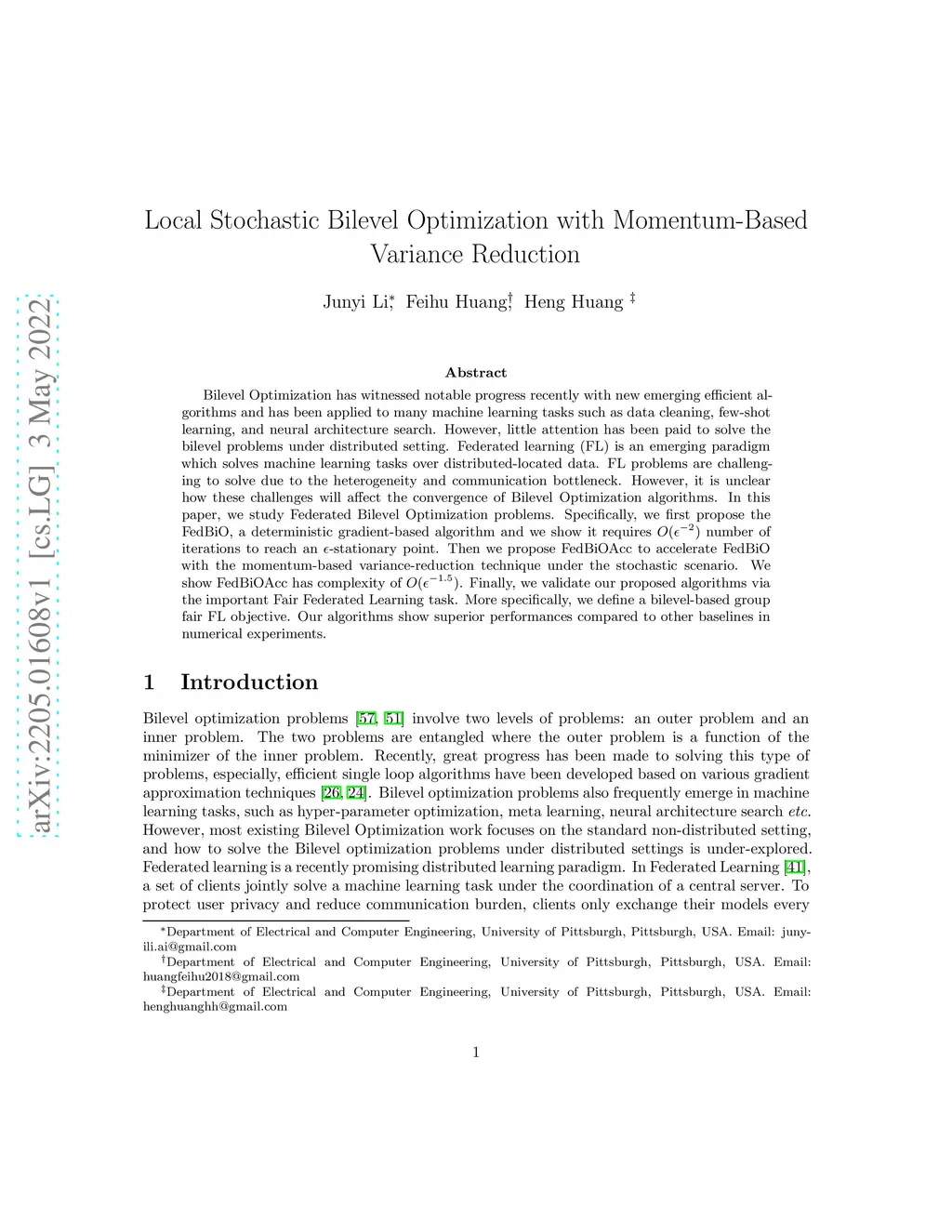 Bilevel Optimization has witnessed notable progress recently with new emerging efficient algorithms and has been applied to many machine learning tasks such as data cleaning, few-shot learning, and neural architecture search. However, little attention has been paid to solve the bilevel problems under distributed setting. Federated learning (FL) is an emerging paradigm which solves machine learning tasks over distributed-located data. FL problems are challenging to solve due to the heterogeneity and communication bottleneck. However, it is unclear how these challenges will affect the convergence of Bilevel Optimization algorithms. In this paper, we study Federated Bilevel Optimization problems. Specifically, we first propose the FedBiO, a deterministic gradient-based algorithm and we show it requires number of iterations to reach an -stationary point. Then we propose FedBiOAcc to accelerate FedBiO with the momentum-based variance-reduction technique under the stochastic scenario. We show FedBiOAcc has complexity of . Finally, we validate our proposed algorithms via the important Fair Federated Learning task. More specifically, we define a bilevel-based group fair FL objective. Our algorithms show superior performances compared to other baselines in numerical experiments.