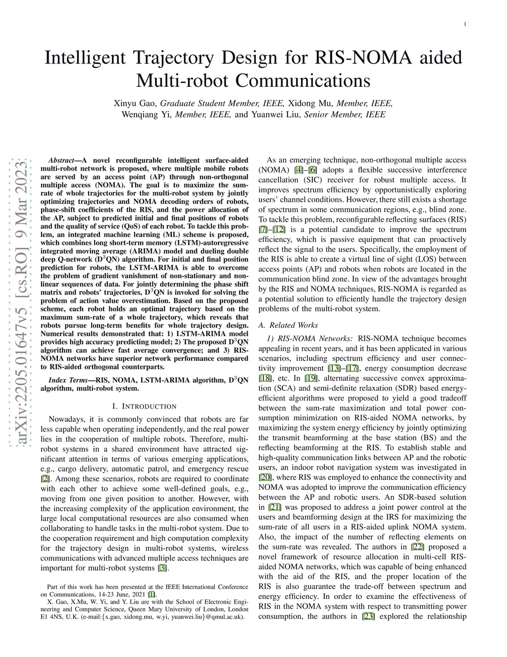 A novel reconfigurable intelligent surface-aided multi-robot network is proposed, where multiple mobile robots are served by an access point (AP) through non-orthogonal multiple access (NOMA). The goal is to maximize the sum-rate of whole trajectories for the multi-robot system by jointly optimizing trajectories and NOMA decoding orders of robots, phase-shift coefficients of the RIS, and the power allocation of the AP, subject to predicted initial and final positions of robots and the quality of service (QoS) of each robot. To tackle this problem, an integrated machine learning (ML) scheme is proposed, which combines long short-term memory (LSTM)-autoregressive integrated moving average (ARIMA) model and dueling double deep Q-network (DQN) algorithm. For initial and final position prediction for robots, the LSTM-ARIMA is able to overcome the problem of gradient vanishment of non-stationary and non-linear sequences of data. For jointly determining the phase shift matrix and robots' trajectories, DQN is invoked for solving the problem of action value overestimation. Based on the proposed scheme, each robot holds an optimal trajectory based on the maximum sum-rate of a whole trajectory, which reveals that robots pursue long-term benefits for whole trajectory design. Numerical results demonstrated that: 1) LSTM-ARIMA model provides high accuracy predicting model; 2) The proposed DQN algorithm can achieve fast average convergence; and 3) RIS-NOMA networks have superior network performance compared to RIS-aided orthogonal counterparts.