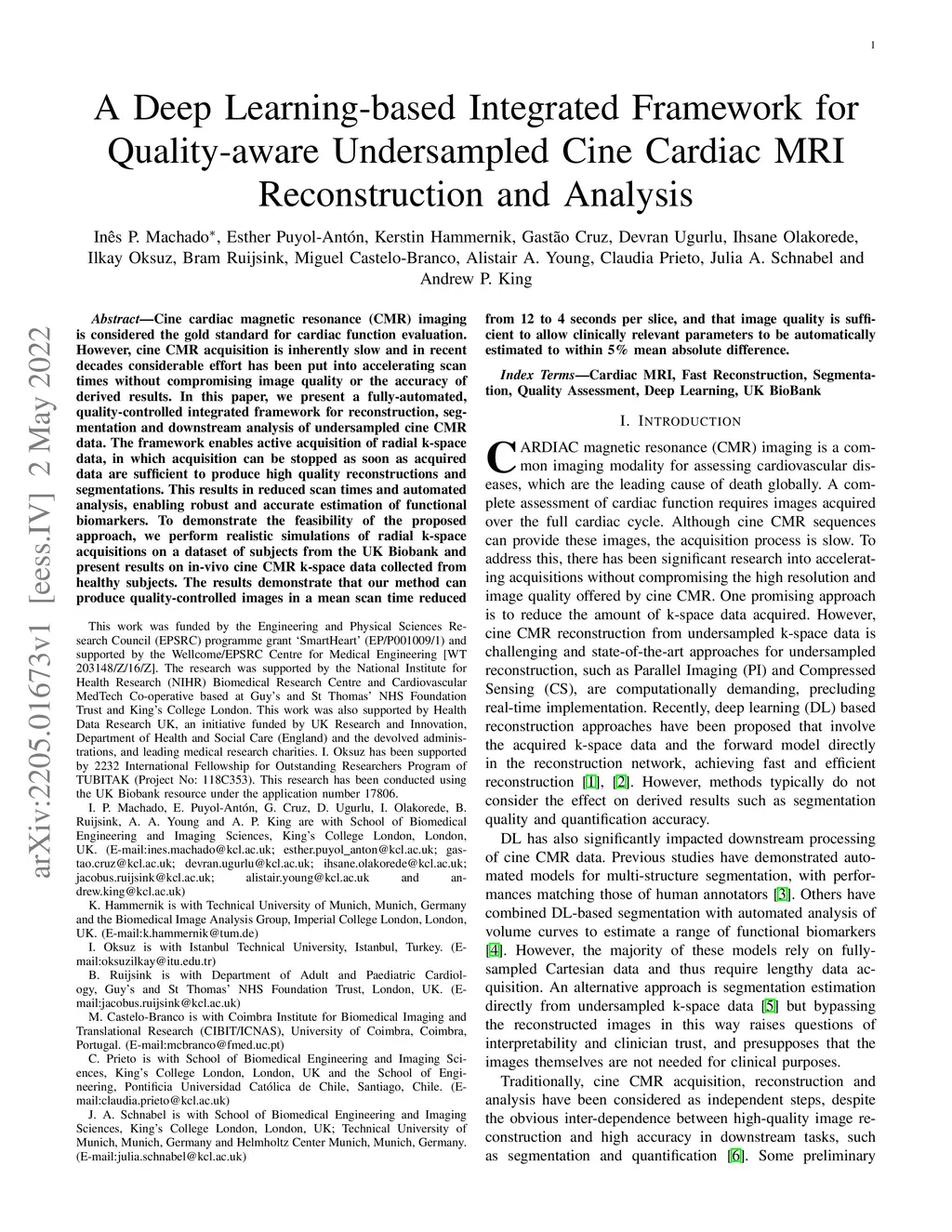 Cine cardiac magnetic resonance (CMR) imaging is considered the gold standard for cardiac function evaluation. However, cine CMR acquisition is inherently slow and in recent decades considerable effort has been put into accelerating scan times without compromising image quality or the accuracy of derived results. In this paper, we present a fully-automated, quality-controlled integrated framework for reconstruction, segmentation and downstream analysis of undersampled cine CMR data. The framework enables active acquisition of radial k-space data, in which acquisition can be stopped as soon as acquired data are sufficient to produce high quality reconstructions and segmentations. This results in reduced scan times and automated analysis, enabling robust and accurate estimation of functional biomarkers. To demonstrate the feasibility of the proposed approach, we perform realistic simulations of radial k-space acquisitions on a dataset of subjects from the UK Biobank and present results on in-vivo cine CMR k-space data collected from healthy subjects. The results demonstrate that our method can produce quality-controlled images in a mean scan time reduced from 12 to 4 seconds per slice, and that image quality is sufficient to allow clinically relevant parameters to be automatically estimated to within 5% mean absolute difference.