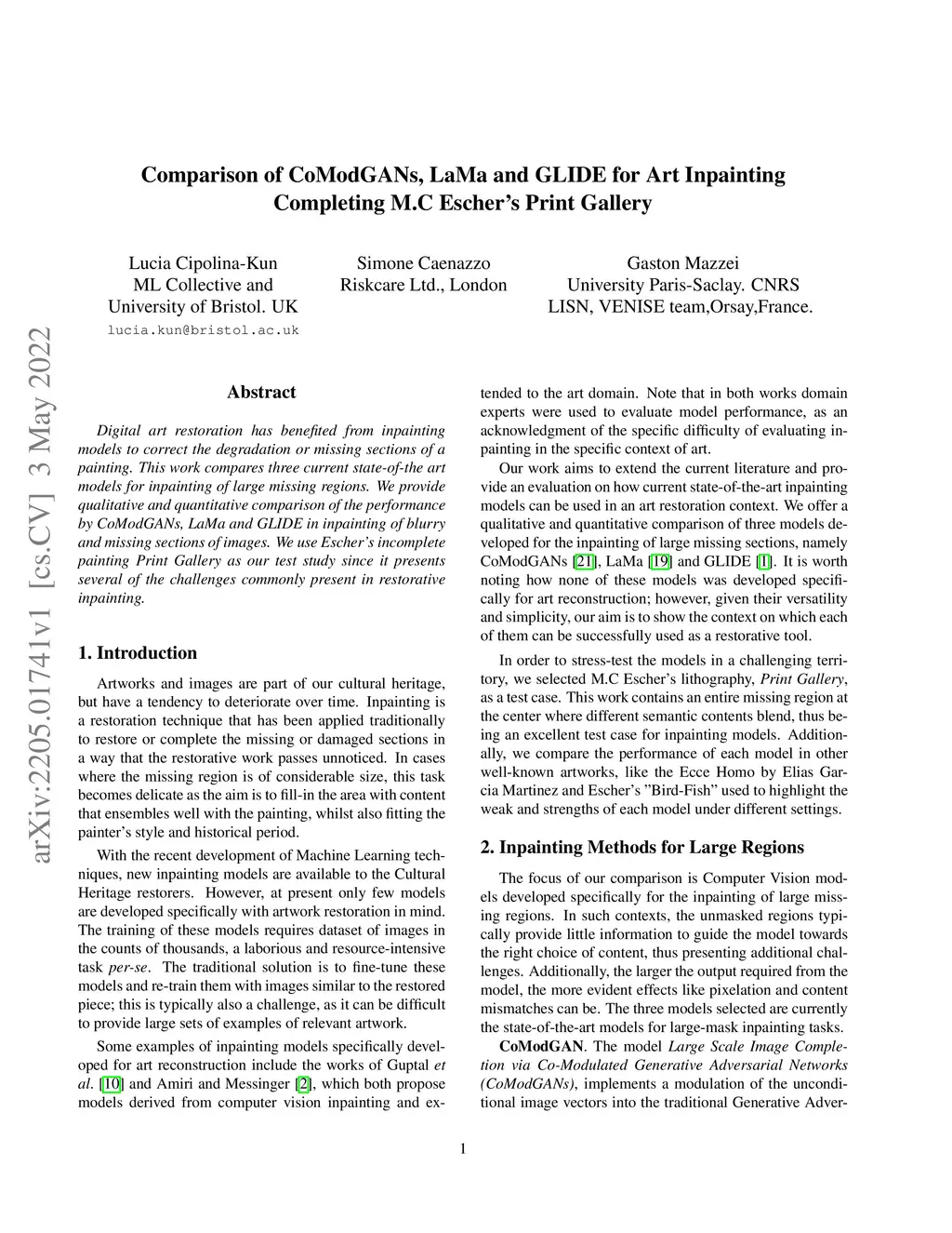 Comparison of CoModGANs, LaMa and GLIDE for Art Inpainting- Completing