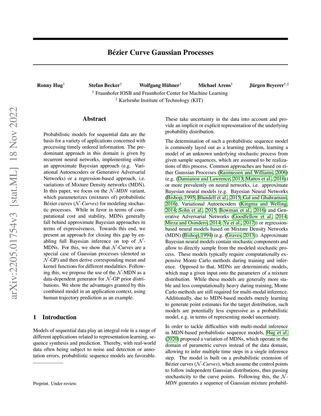Probabilistic models for sequential data are the basis for a variety of applications concerned with processing timely ordered information. The predominant approach in this domain is given by recurrent neural networks, implementing either an approximate Bayesian approach (e.g. Variational Autoencoders or Generative Adversarial Networks) or a regression-based approach, i.e. variations of Mixture Density networks (MDN). In this paper, we focus on the -MDN variant, which parameterizes (mixtures of) probabilistic B\ézier curves (-Curves) for modeling stochastic processes. While in favor in terms of computational cost and stability, MDNs generally fall behind approximate Bayesian approaches in terms of expressiveness. Towards this end, we present an approach for closing this gap by enabling full Bayesian inference on top of -MDNs. For this, we show that -Curves are a special case of Gaussian processes (denoted as -GP) and then derive corresponding mean and kernel functions for different modalities. Following this, we propose the use of the -MDN as a data-dependent generator for -GP prior distributions. We show the advantages granted by this combined model in an application context, using human trajectory prediction as an example.