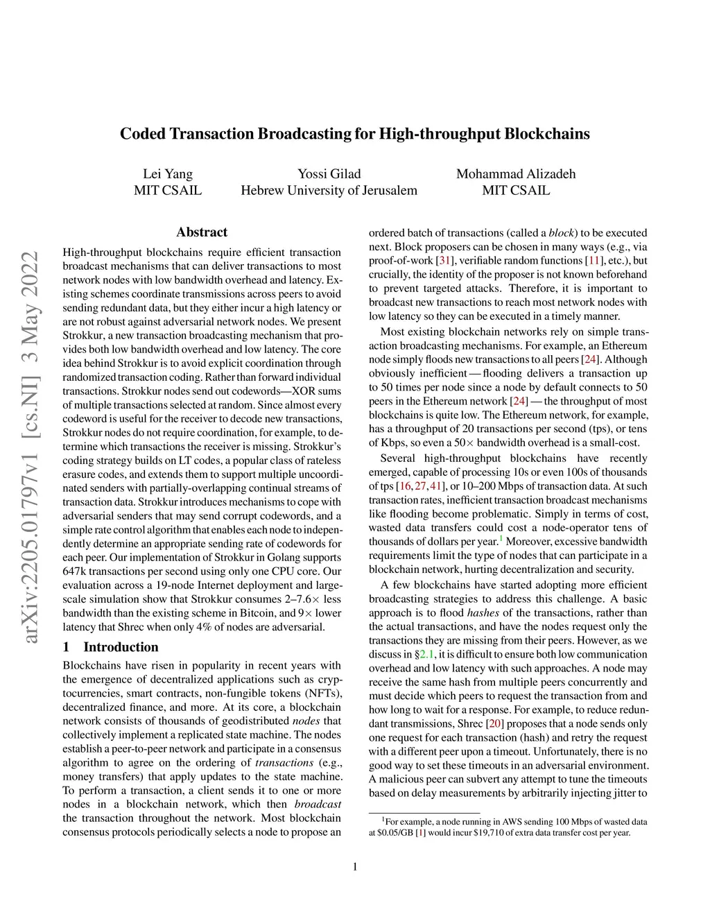 High-throughput blockchains require efficient transaction broadcast mechanisms that can deliver transactions to most network nodes with low bandwidth overhead and latency. Existing schemes coordinate transmissions across peers to avoid sending redundant data, but they either incur a high latency or are not robust against adversarial network nodes. We present Strokkur, a new transaction broadcasting mechanism that provides both low bandwidth overhead and low latency. The core idea behind Strokkur is to avoid explicit coordination through randomized transaction coding. Rather than forward individual transactions. Strokkur nodes send out codewords -- XOR sums of multiple transactions selected at random. Since almost every codeword is useful for the receiver to decode new transactions, Strokkur nodes do not require coordination, for example, to determine which transactions the receiver is missing. Strokkur's coding strategy builds on LT codes, a popular class of rateless erasure codes, and extends them to support multiple uncoordinated senders with partially-overlapping continual streams of transaction data. Strokkur introduces mechanisms to cope with adversarial senders that may send corrupt codewords, and a simple rate control algorithm that enables each node to independently determine an appropriate sending rate of codewords for each peer. Our implementation of Strokkur in Golang supports 647k transactions per second using only one CPU core. Our evaluation across a 19-node Internet deployment and large-scale simulation show that Strokkur consumes 2--7.6x less bandwidth than the existing scheme in Bitcoin, and 9x lower latency that Shrec when only 4% of nodes are adversarial.