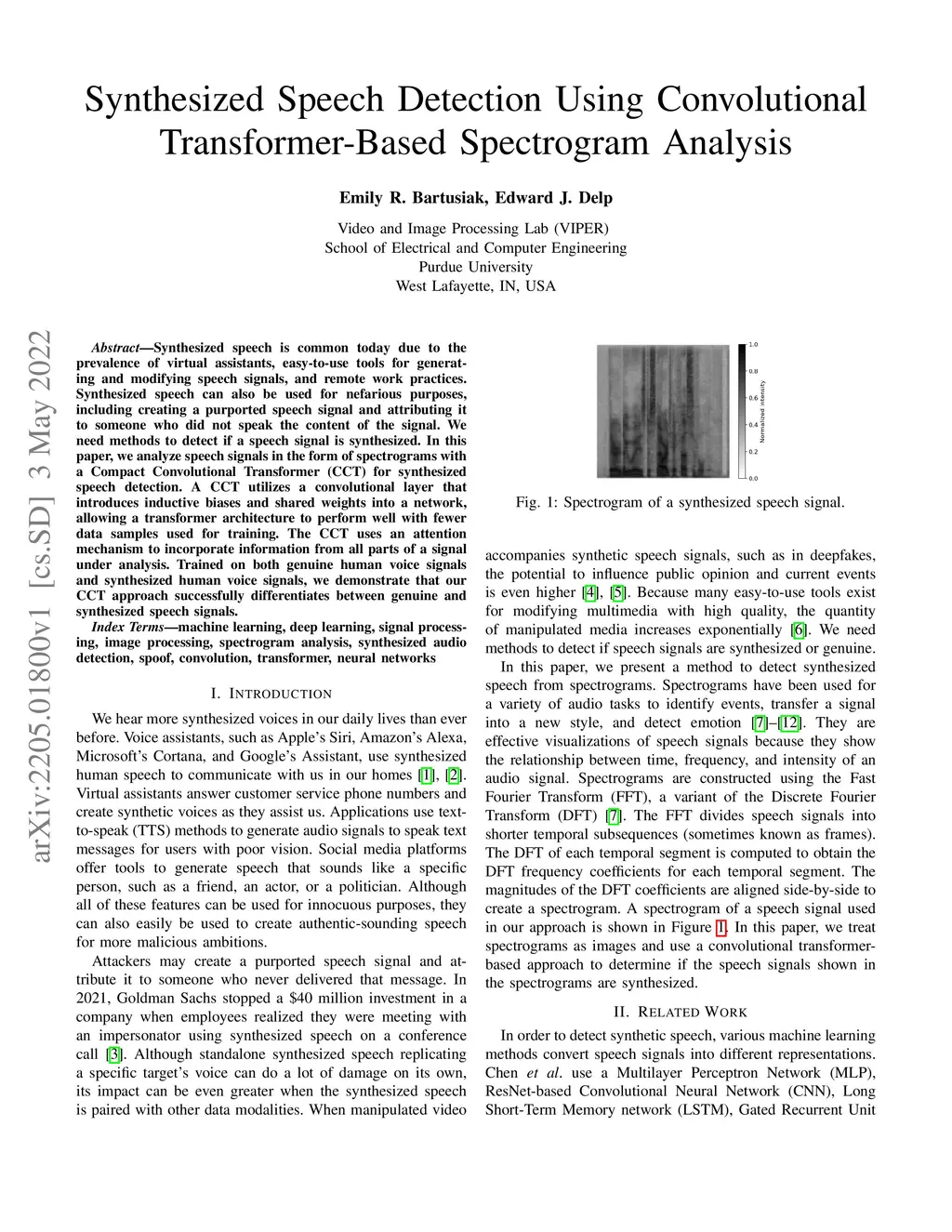 Synthesized speech is common today due to the prevalence of virtual assistants, easy-to-use tools for generating and modifying speech signals, and remote work practices. Synthesized speech can also be used for nefarious purposes, including creating a purported speech signal and attributing it to someone who did not speak the content of the signal. We need methods to detect if a speech signal is synthesized. In this paper, we analyze speech signals in the form of spectrograms with a Compact Convolutional Transformer (CCT) for synthesized speech detection. A CCT utilizes a convolutional layer that introduces inductive biases and shared weights into a network, allowing a transformer architecture to perform well with fewer data samples used for training. The CCT uses an attention mechanism to incorporate information from all parts of a signal under analysis. Trained on both genuine human voice signals and synthesized human voice signals, we demonstrate that our CCT approach successfully differentiates between genuine and synthesized speech signals.
