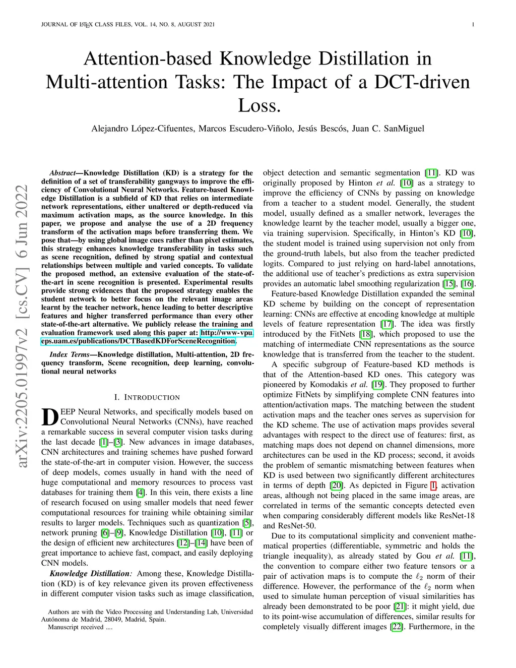Knowledge Distillation (KD) is a strategy for the definition of a set of transferability gangways to improve the efficiency of Convolutional Neural Networks. Feature-based Knowledge Distillation is a subfield of KD that relies on intermediate network representations, either unaltered or depth-reduced via maximum activation maps, as the source knowledge. In this paper, we propose and analyse the use of a 2D frequency transform of the activation maps before transferring them. We pose that\textemdash by using global image cues rather than pixel estimates, this strategy enhances knowledge transferability in tasks such as scene recognition, defined by strong spatial and contextual relationships between multiple and varied concepts. To validate the proposed method, an extensive evaluation of the state-of-the-art in scene recognition is presented. Experimental results provide strong evidences that the proposed strategy enables the student network to better focus on the relevant image areas learnt by the teacher network, hence leading to better descriptive features and higher transferred performance than every other state-of-the-art alternative. We publicly release the training and evaluation framework used along this paper at http://www-vpu.eps.uam.es/publications/DCTBasedKDForSceneRecognition.