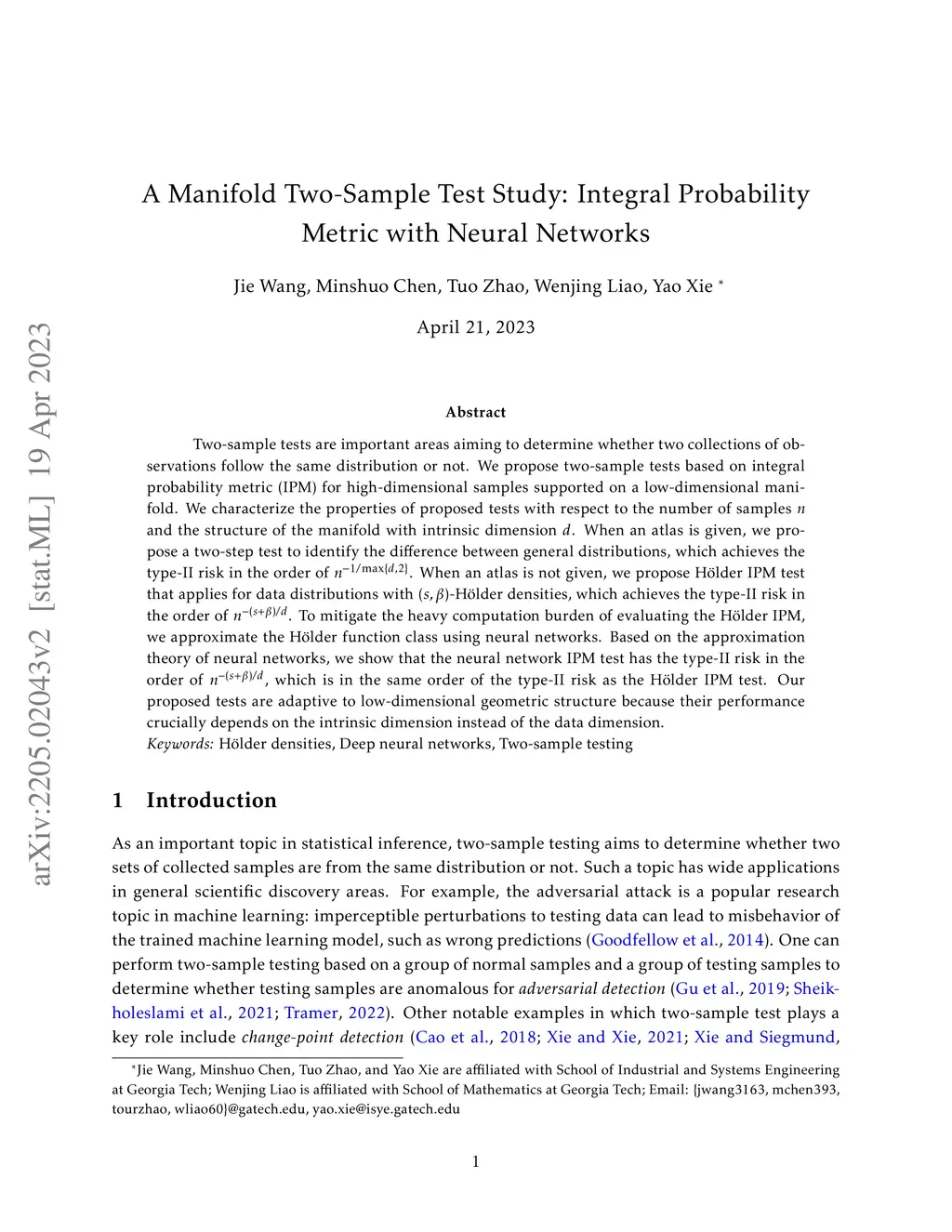 Two-sample tests are important areas aiming to determine whether two collections of observations follow the same distribution or not. We propose two-sample tests based on integral probability metric (IPM) for high-dimensional samples supported on a low-dimensional manifold. We characterize the properties of proposed tests with respect to the number of samples and the structure of the manifold with intrinsic dimension . When an atlas is given, we propose two-step test to identify the difference between general distributions, which achieves the type-II risk in the order of . When an atlas is not given, we propose H\"older IPM test that applies for data distributions with -H\"older densities, which achieves the type-II risk in the order of . To mitigate the heavy computation burden of evaluating the H\"older IPM, we approximate the H\"older function class using neural networks. Based on the approximation theory of neural networks, we show that the neural network IPM test has the type-II risk in the order of , which is in the same order of the type-II risk as the H\"older IPM test. Our proposed tests are adaptive to low-dimensional geometric structure because their performance crucially depends on the intrinsic dimension instead of the data dimension.