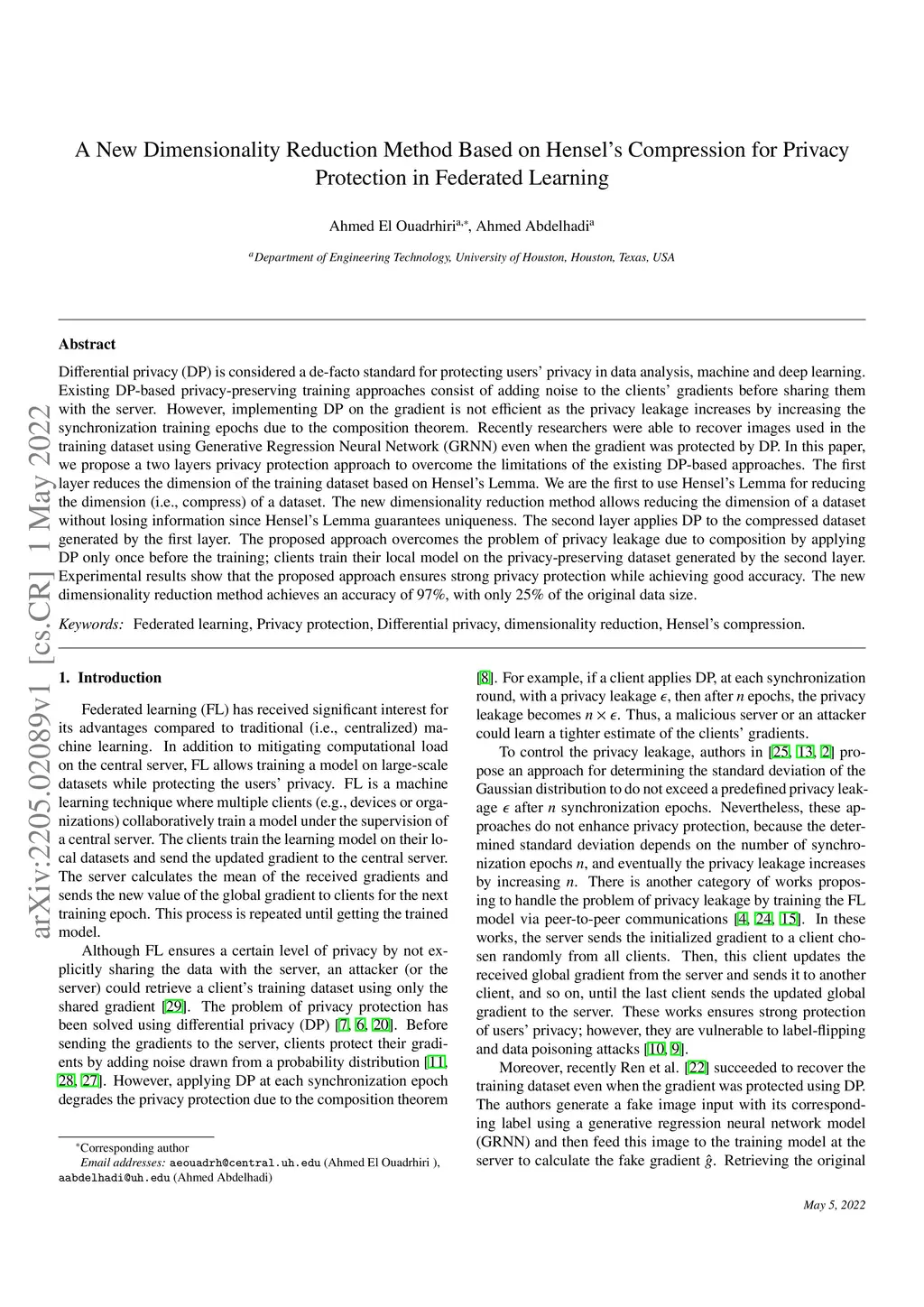 Differential privacy (DP) is considered a de-facto standard for protecting users' privacy in data analysis, machine, and deep learning. Existing DP-based privacy-preserving training approaches consist of adding noise to the clients' gradients before sharing them with the server. However, implementing DP on the gradient is not efficient as the privacy leakage increases by increasing the synchronization training epochs due to the composition theorem. Recently researchers were able to recover images used in the training dataset using Generative Regression Neural Network (GRNN) even when the gradient was protected by DP. In this paper, we propose two layers of privacy protection approach to overcome the limitations of the existing DP-based approaches. The first layer reduces the dimension of the training dataset based on Hensel's Lemma. We are the first to use Hensel's Lemma for reducing the dimension (i.e., compress) of a dataset. The new dimensionality reduction method allows reducing the dimension of a dataset without losing information since Hensel's Lemma guarantees uniqueness. The second layer applies DP to the compressed dataset generated by the first layer. The proposed approach overcomes the problem of privacy leakage due to composition by applying DP only once before the training; clients train their local model on the privacy-preserving dataset generated by the second layer. Experimental results show that the proposed approach ensures strong privacy protection while achieving good accuracy. The new dimensionality reduction method achieves an accuracy of 97%, with only 25 % of the original data size.