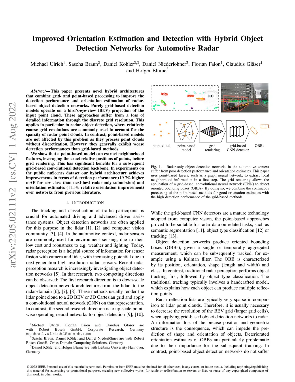 This paper presents novel hybrid architectures that combine grid- and point-based processing to improve the detection performance and orientation estimation of radar-based object detection networks. Purely grid-based detection models operate on a bird's-eye-view (BEV) projection of the input point cloud. These approaches suffer from a loss of detailed information through the discrete grid resolution. This applies in particular to radar object detection, where relatively coarse grid resolutions are commonly used to account for the sparsity of radar point clouds. In contrast, point-based models are not affected by this problem as they process point clouds without discretization. However, they generally exhibit worse detection performances than grid-based methods. We show that a point-based model can extract neighborhood features, leveraging the exact relative positions of points, before grid rendering. This has significant benefits for a subsequent grid-based convolutional detection backbone. In experiments on the public nuScenes dataset our hybrid architecture achieves improvements in terms of detection performance (19.7% higher mAP for car class than next-best radar-only submission) and orientation estimates (11.5% relative orientation improvement) over networks from previous literature.