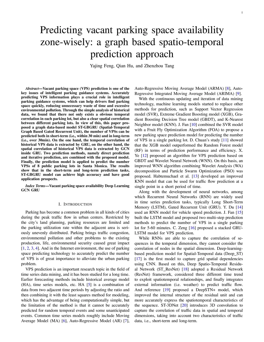 Vacant parking space (VPS) prediction is one of the key issues of intelligent parking guidance systems. Accurately predicting VPS information plays a crucial role in intelligent parking guidance systems, which can help drivers find parking space quickly, reducing unnecessary waste of time and excessive environmental pollution. Through the simple analysis of historical data, we found that there not only exists a obvious temporal correlation in each parking lot, but also a clear spatial correlation between different parking lots. In view of this, this paper proposed a graph data-based model ST-GBGRU (Spatial-Temporal Graph Based Gated Recurrent Unit), the number of VPSs can be predicted both in short-term (i.e., within 30 min) and in long-term (i.e., over 30min). On the one hand, the temporal correlation of historical VPS data is extracted by GRU, on the other hand, the spatial correlation of historical VPS data is extracted by GCN inside GRU. Two prediction methods, namely direct prediction and iterative prediction, are combined with the proposed model. Finally, the prediction model is applied to predict the number VPSs of 8 public parking lots in Santa Monica. The results show that in the short-term and long-term prediction tasks, ST-GBGRU model can achieve high accuracy and have good application prospects.