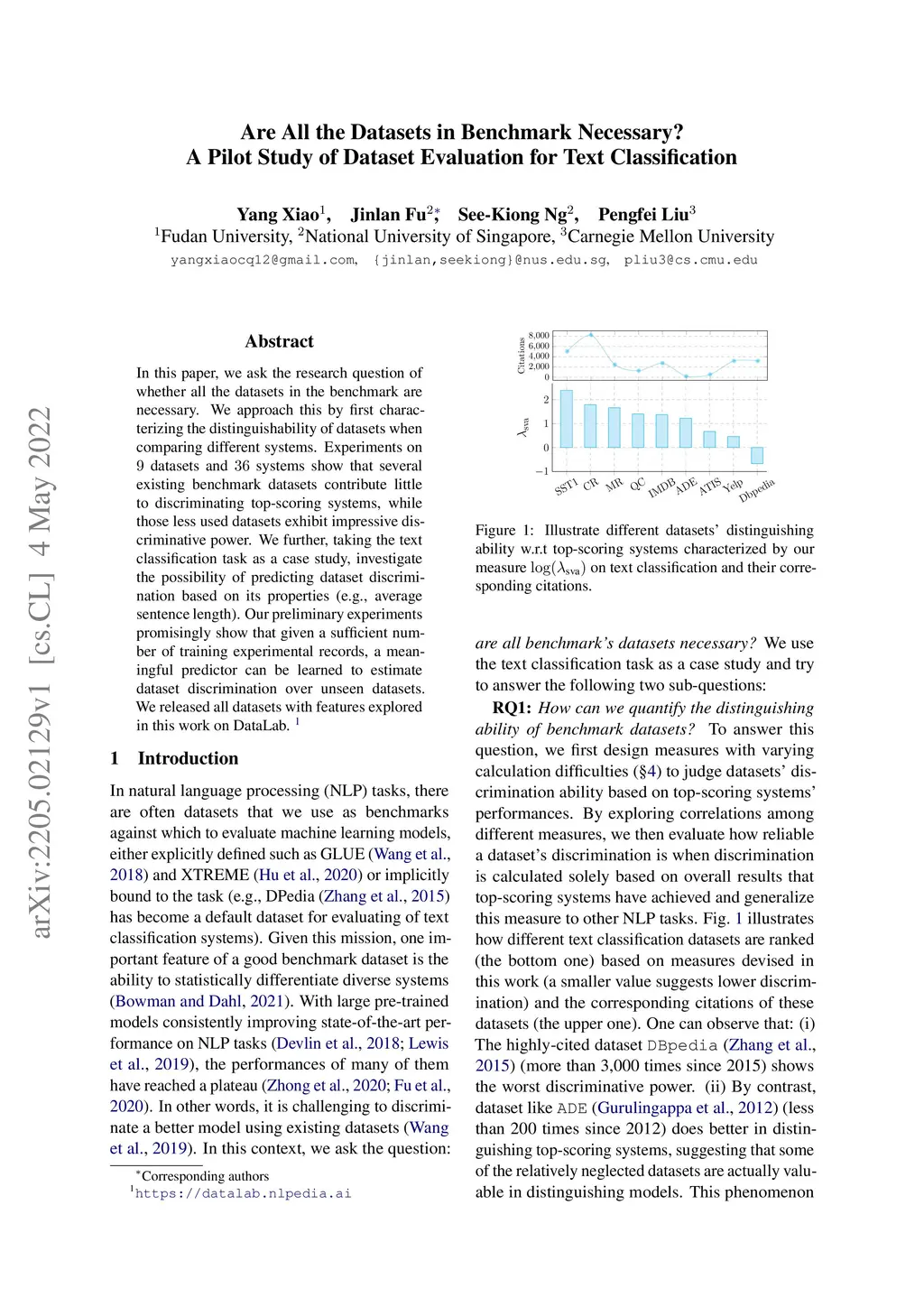 In this paper, we ask the research question of whether all the datasets in the benchmark are necessary. We approach this by first characterizing the distinguishability of datasets when comparing different systems. Experiments on 9 datasets and 36 systems show that several existing benchmark datasets contribute little to discriminating top-scoring systems, while those less used datasets exhibit impressive discriminative power. We further, taking the text classification task as a case study, investigate the possibility of predicting dataset discrimination based on its properties (e.g., average sentence length). Our preliminary experiments promisingly show that given a sufficient number of training experimental records, a meaningful predictor can be learned to estimate dataset discrimination over unseen datasets. We released all datasets with features explored in this work on DataLab: \url{https://datalab.nlpedia.ai}.
