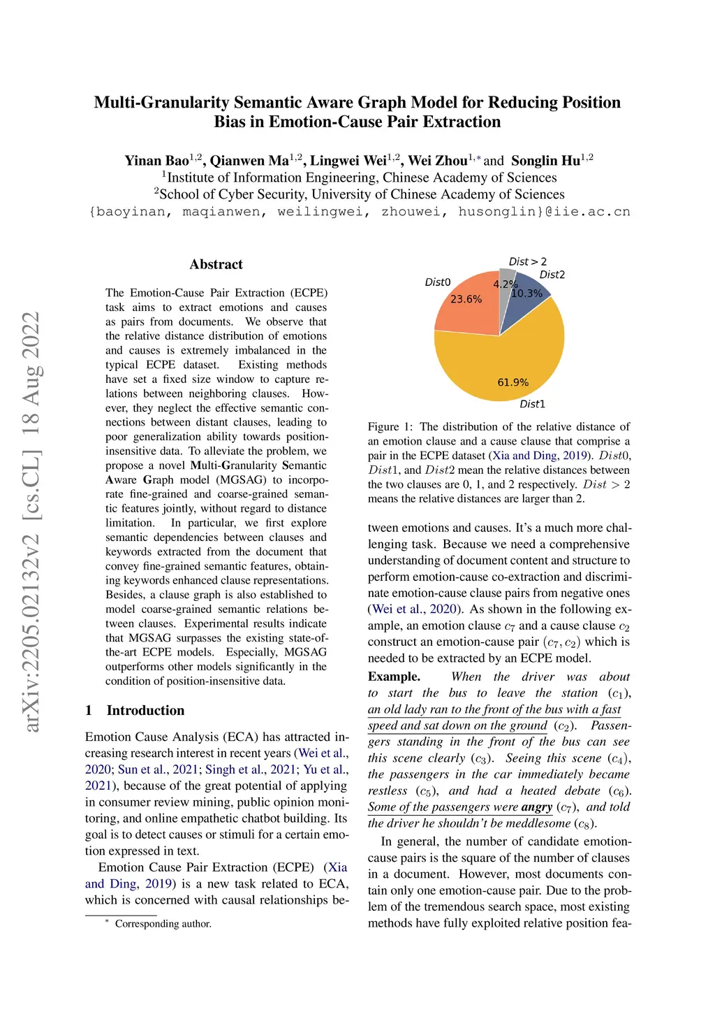 The Emotion-Cause Pair Extraction (ECPE) task aims to extract emotions and causes as pairs from documents. We observe that the relative distance distribution of emotions and causes is extremely imbalanced in the typical ECPE dataset. Existing methods have set a fixed size window to capture relations between neighboring clauses. However, they neglect the effective semantic connections between distant clauses, leading to poor generalization ability towards position-insensitive data. To alleviate the problem, we propose a novel Multi-Granularity Semantic Aware Graph model (MGSAG) to incorporate fine-grained and coarse-grained semantic features jointly, without regard to distance limitation. In particular, we first explore semantic dependencies between clauses and keywords extracted from the document that convey fine-grained semantic features, obtaining keywords enhanced clause representations. Besides, a clause graph is also established to model coarse-grained semantic relations between clauses. Experimental results indicate that MGSAG surpasses the existing state-of-the-art ECPE models. Especially, MGSAG outperforms other models significantly in the condition of position-insensitive data.