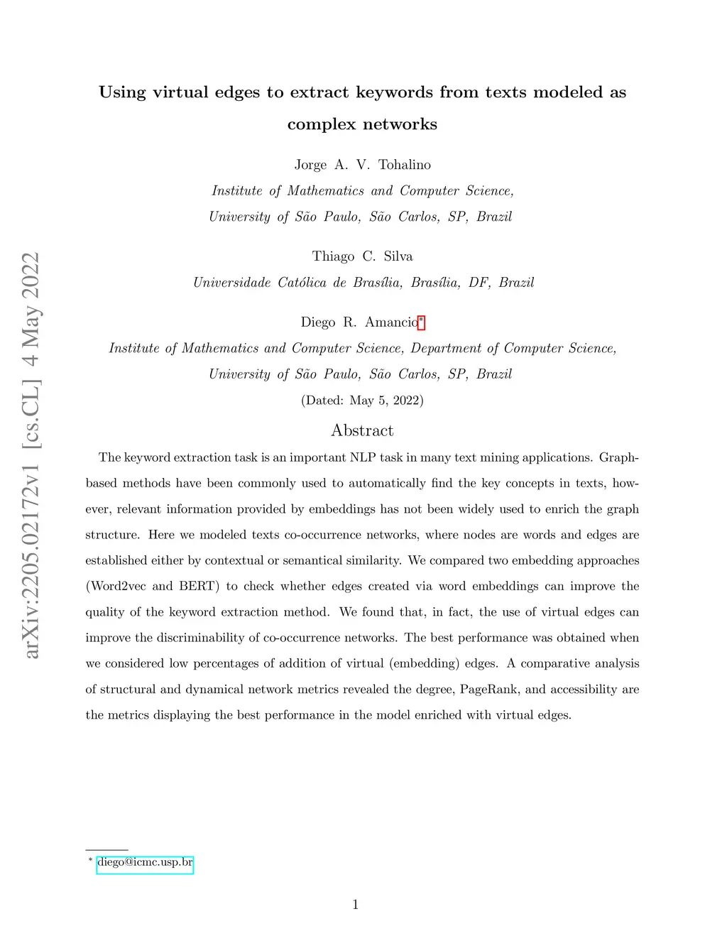 Detecting keywords in texts is important for many text mining applications. Graph-based methods have been commonly used to automatically find the key concepts in texts, however, relevant information provided by embeddings has not been widely used to enrich the graph structure. Here we modeled texts co-occurrence networks, where nodes are words and edges are established either by contextual or semantical similarity. We compared two embedding approaches -- Word2vec and BERT -- to check whether edges created via word embeddings can improve the quality of the keyword extraction method. We found that, in fact, the use of virtual edges can improve the discriminability of co-occurrence networks. The best performance was obtained when we considered low percentages of addition of virtual (embedding) edges. A comparative analysis of structural and dynamical network metrics revealed the degree, PageRank, and accessibility are the metrics displaying the best performance in the model enriched with virtual edges.