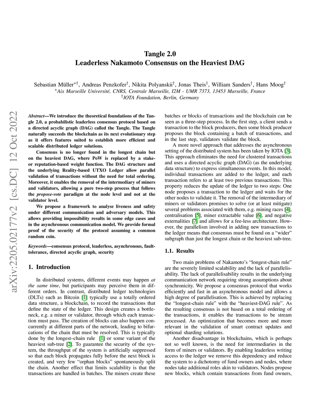 We introduce the theoretical foundations of the Tangle 2.0, a probabilistic leaderless consensus protocol based on a directed acyclic graph (DAG) called the Tangle. The Tangle naturally succeeds the blockchain as its next evolutionary step as it offers features suited to establish more efficient and scalable distributed ledger solutions. Consensus is no longer found in the longest chain but on the heaviest DAG, where PoW is replaced by a stake- or reputation-based weight function. The DAG structure and the underlying Reality-based UTXO Ledger allow parallel validation of transactions without the need for total ordering. Moreover, it enables the removal of the intermediary of miners and validators, allowing a pure two-step process that follows the \emph{propose-vote} paradigm at the node level and not at the validator level. We propose a framework to analyse liveness and safety under different communication and adversary models. This allows providing impossibility results in some edge cases and in the asynchronous communication model. We provide formal proof of the security of the protocol assuming a common random coin.