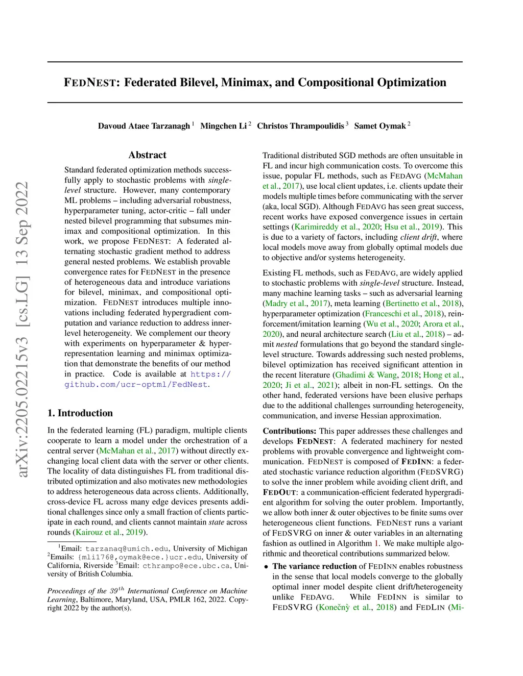 Standard federated optimization methods successfully apply to stochastic problems with single-level structure. However, many contemporary ML problems -- including adversarial robustness, hyperparameter tuning, and actor-critic -- fall under nested bilevel programming that subsumes minimax and compositional optimization. In this work, we propose \fedblo: A federated alternating stochastic gradient method to address general nested problems. We establish provable convergence rates for \fedblo in the presence of heterogeneous data and introduce variations for bilevel, minimax, and compositional optimization. \fedblo introduces multiple innovations including federated hypergradient computation and variance reduction to address inner-level heterogeneity. We complement our theory with experiments on hyperparameter \& hyper-representation learning and minimax optimization that demonstrate the benefits of our method in practice. Code is available at https://github.com/ucr-optml/FedNest.